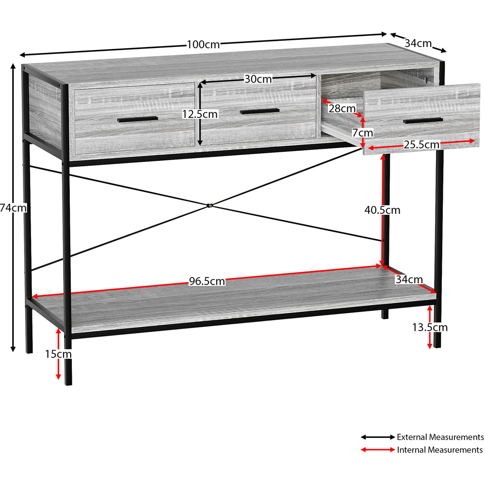 Enhance your home decor with this versatile and eye-catching Home Vida Brooklyn 3-Drawer Industrial Console Table with an underneath shelf, featuring a sturdy iron frame in an industrial style. This captivating piece effortlessly combines rustic charm with modern aesthetics. The spacious drawers offer convenient storage, while the underneath shelf provides additional display or organization space. Crafted with a grey finish and an iron frame, it adds an edgy touch to any room. Perfect for those seeking an industrial-inspired vibe, this console table merges functionality and style flawlessly. Dimensions: H74 x W100 x D34cm.