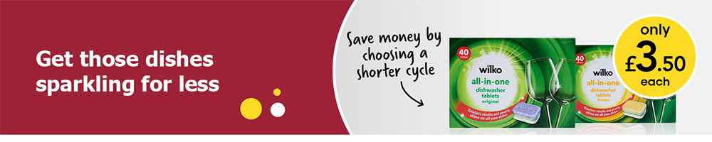 Get your pots sparkling in no time with our wide range of dishwasher tablets that are designed to remove much of the need for elbow grease! Find a tablet in your favourite fragrance as well as all your much-loved brands, including wilko brand, Fairy and Finish.