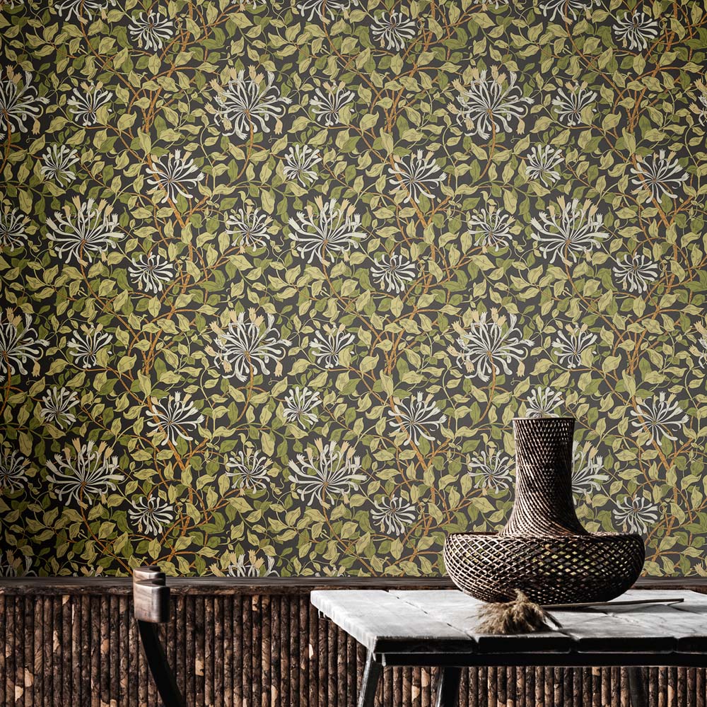 Realistic honeysuckle vines intertwine with leaves and weave across the wall. Inspired by the detailed illustration by May Morris this design pays homage to the arts and craft design era.