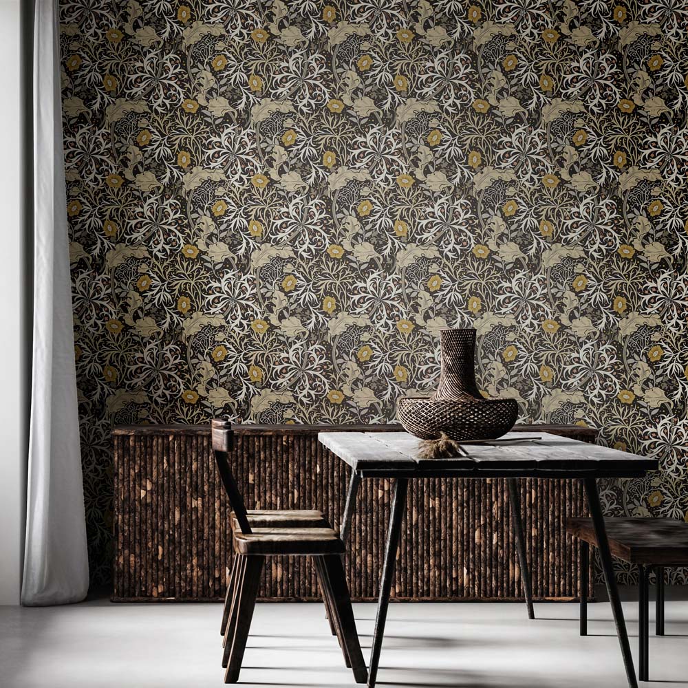 Submerged tangled plants entwine and crisscross to create graceful movement and waves on the wall. A feast of foliage and seaweed heads, this illustrated design is a beautiful interpretation of John Dearle’s design for William Morris.