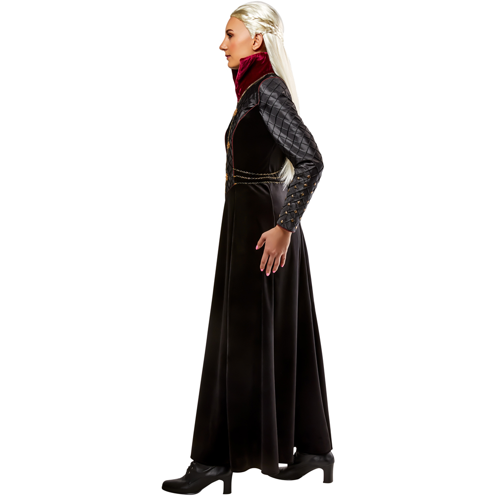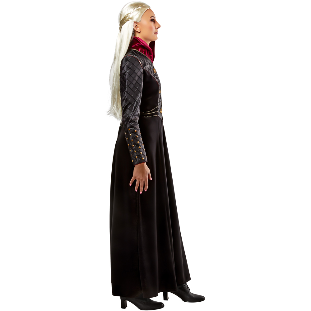 Get ready to command the Seven Kingdoms this Halloween with the Rubies Masquerade House of Dragon Rhaenyra Targaryen Costume Large. This costume is inspired by the strong and determined Rhae Targaryen, a key player in the epic struggle for the Iron Throne. This costume features a flowing gown with rich, deep colours, reminiscent of the royal attire worn by Rhae Targaryen herself. The gown is adorned with elegant details, including intricate embroidery and a flattering, fitted bodice. This costume is ideal for themed parties like Halloween. Rule with strength and authority while wearing this royal ensemble. The costume has undergone comprehensive safety testing where applicable, meeting all relevant regulations.