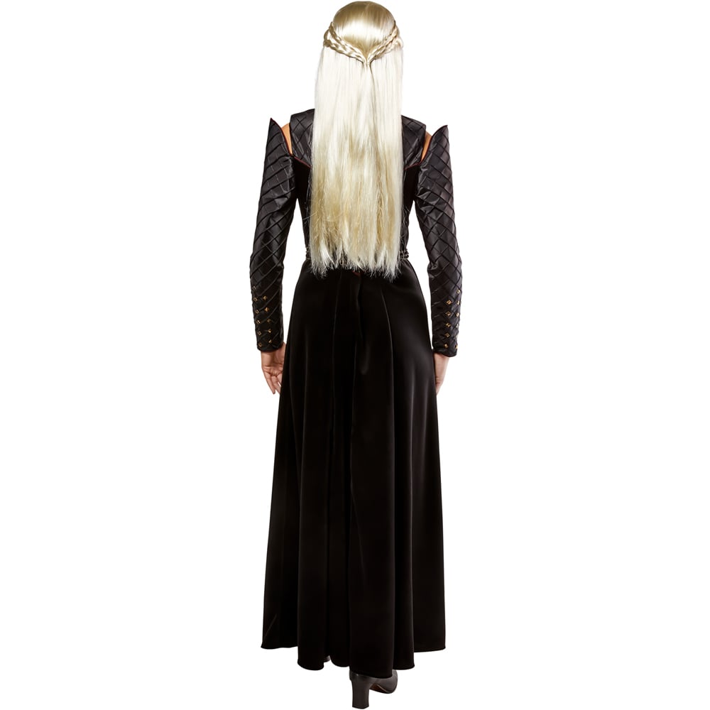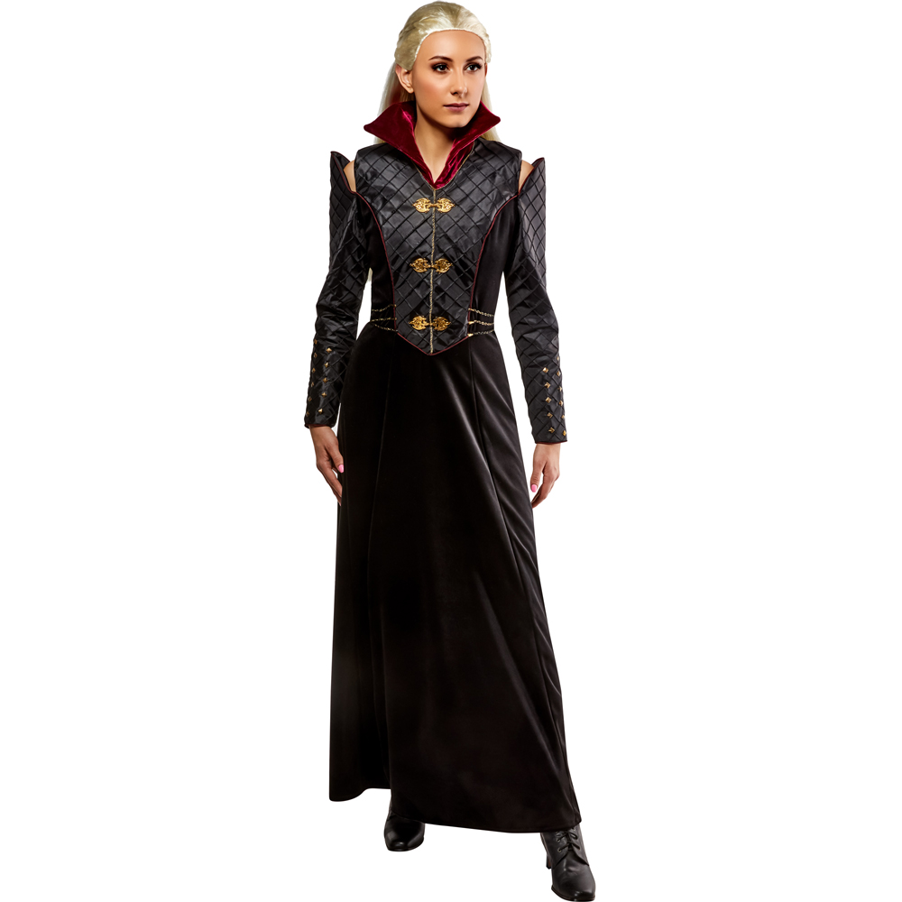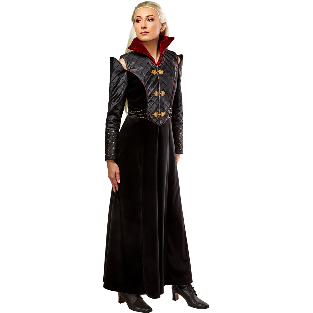 Get ready to command the Seven Kingdoms this Halloween with the Rubies Masquerade House of Dragon Rhaenyra Targaryen Costume Small. This costume is inspired by the strong and determined Rhae Targaryen, a key player in the epic struggle for the Iron Throne. This costume features a flowing gown with rich, deep colours, reminiscent of the royal attire worn by Rhae Targaryen herself. The gown is adorned with elegant details, including intricate embroidery and a flattering, fitted bodice. This costume is ideal for themed parties like Halloween. Rule with strength and authority while wearing this royal ensemble. The costume has undergone comprehensive safety testing where applicable, meeting all relevant regulations.