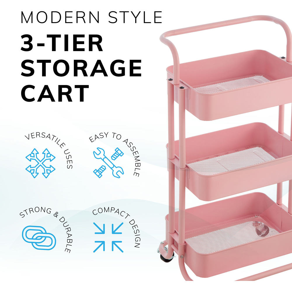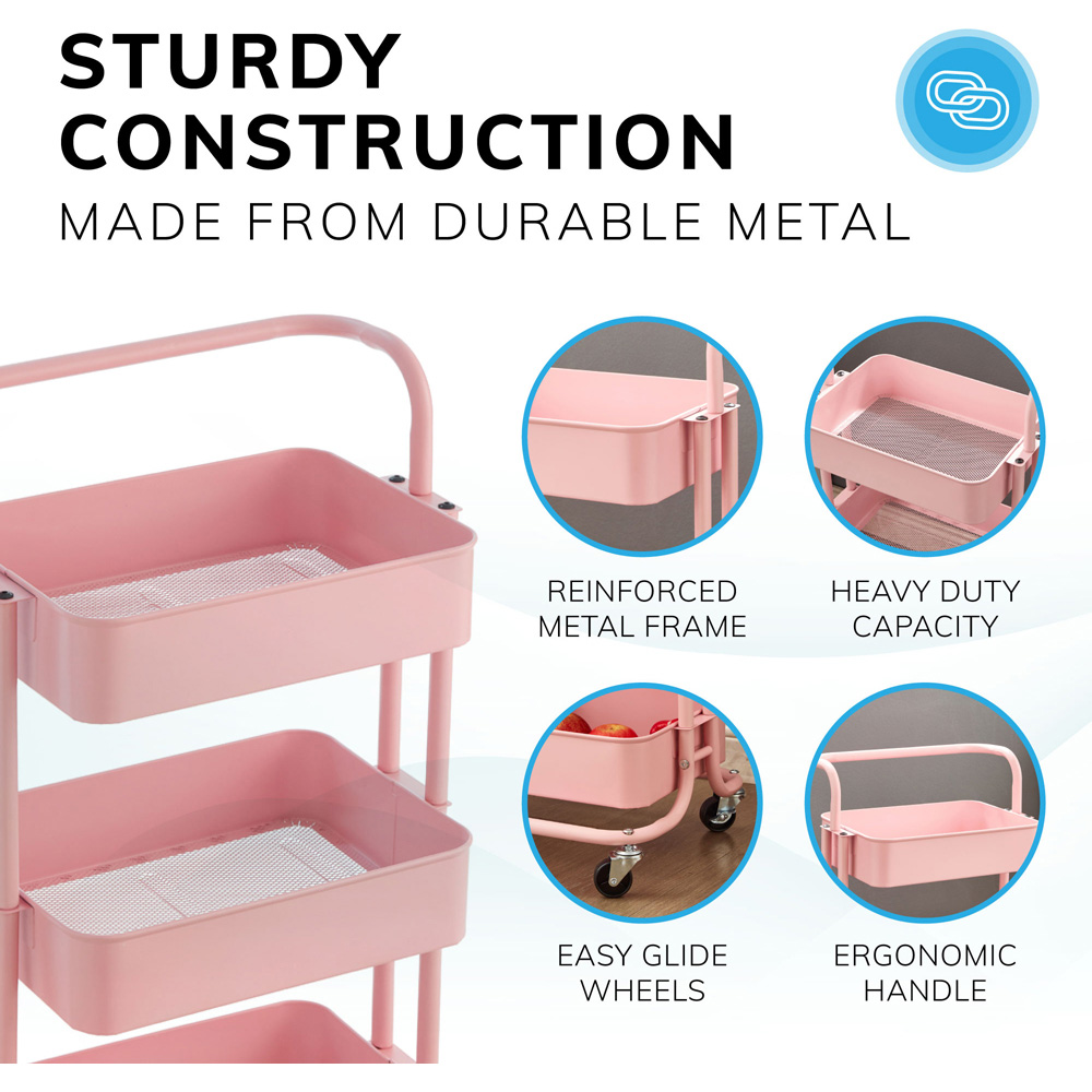 Introducing our 3-Tier Storage Cart Rolling Trolley Cart, a versatile and efficient solution to all your storage needs. Crafted with durable metal utility shelves, this trolley cart is designed to provide maximum storage while taking up minimal space. Ideal for use as a bathroom storage unit, under desk storage, or organiser storage, this rolling cart offers an exceptional blend of practicality and elegance. The three-tier design allows for ample storage space, making it perfect for bathroom storage & organisation, kitchen storage & organisation, or even as a makeup storage unit. The robust metal construction ensures long-lasting durability, while the sleek wheels offer smooth mobility, making it easy to move the cart from one room to another. In the bathroom, this storage trolley serves as an excellent bathroom accessory, providing space for toiletries, towels, and other essentials. For the office, this storage cart on wheels offers essential office storage solutions, accommodating stationary, files, and other office supplies. It also functions effectively as under desk storage, keeping your workspace organised and efficient. This rolling cart storage trolley can match any decor. It also serves as a practical baby trolley organiser, skincare trolley, or utility cart on wheels for various household needs.
