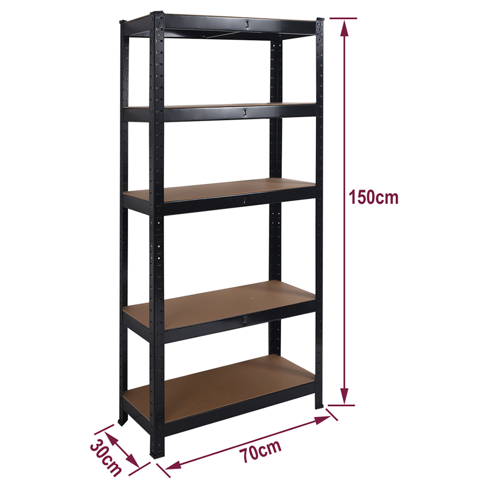 Keep your working area tidy with this House of Home 5-Tier Black Heavy Duty Shelf. This 5-tier racking is ideal for garages, warehouses, workshops and more. The frame has been manufactured using heavy-duty steel and finished in a black powder coating with MDF shelving. With these heavy-duty steel frames, you can simply create a sturdy shelving unit. Apart from this, it features adjustable shelves that permit you to set it as per your requirements. Max loading capacity: 1325 kg – (265kg per shelf). Dimensions: 150cm height x 70cm width x 30cm depth.