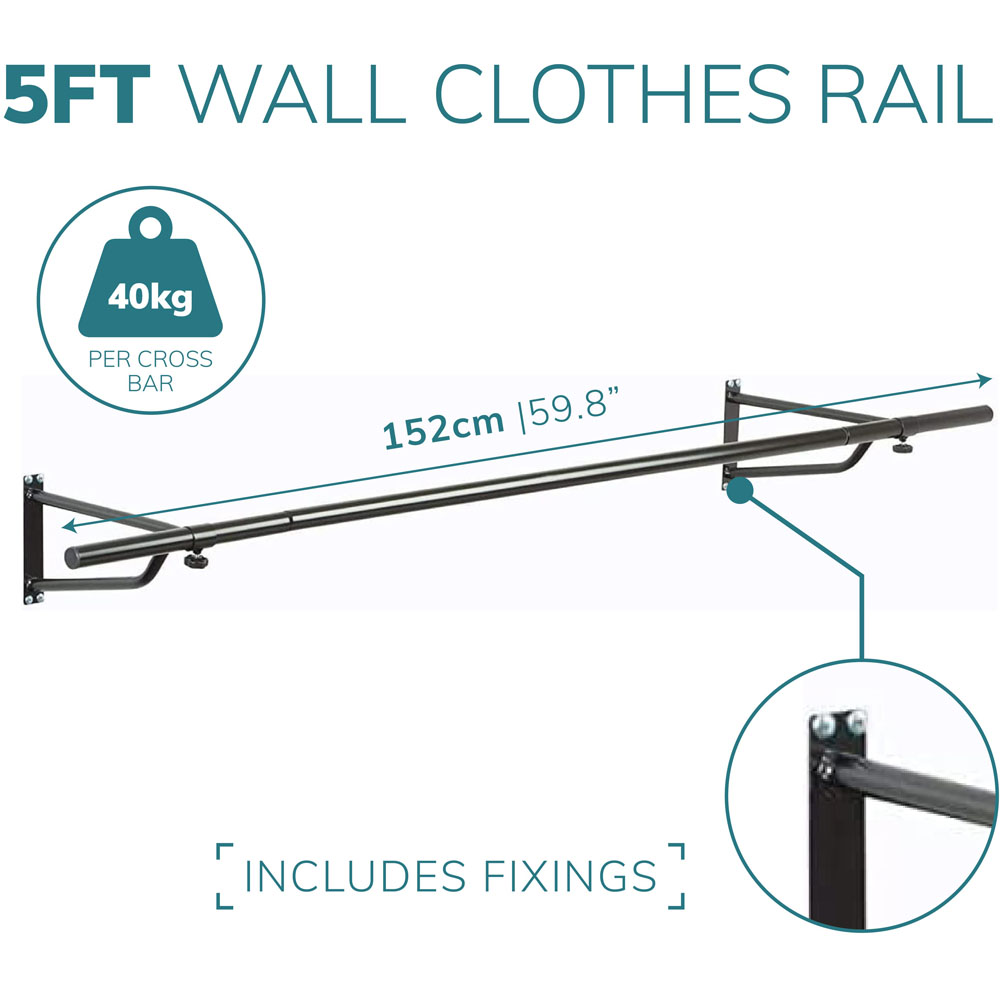 Declutter indoors in style with this House of Home Black 5ft Wall-Mounted Clothes Rail. The wall-mounted clothing rail is perfect for organising your bedroom, walk-in wardrobes or store. These rails are great for hanging all types of clothing including heavier items like coats and jackets. Made from steel and finished in back powder coating, the rail is durable and makes a stylish addition. Comes with fixings and fixtures with a full set of easy-to-assemble instructions. Rail length: 5ft. Tube diameter: 25mm. Brackets - 32cm depth x 15.5cm height x 3cm width.
