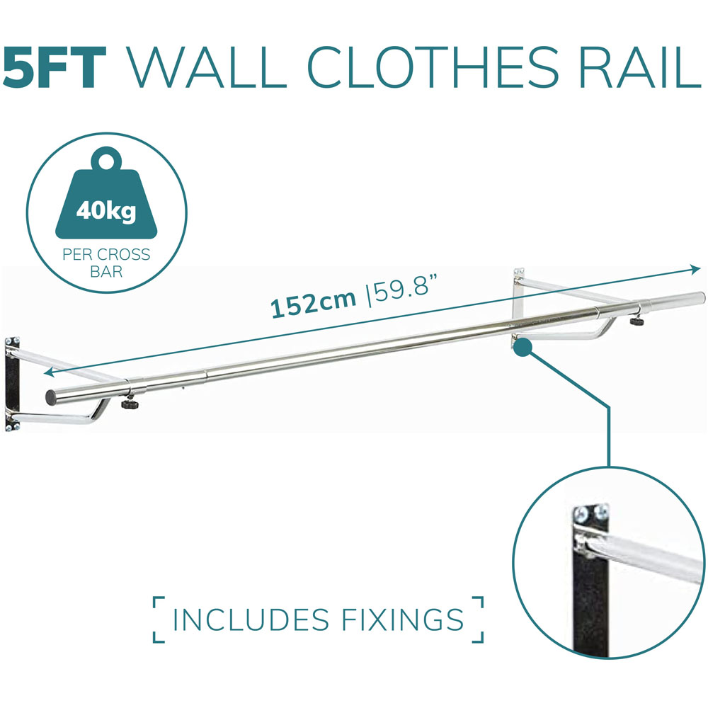 Declutter indoors in style with this House of Home Silver 5ft Wall-Mounted Clothes Rail. The wall-mounted clothing rail is perfect for organising your bedroom, walk-in wardrobes or store. These rails are great for hanging all types of clothing including heavier items like coats and jackets. Made from steel and finished in chrome, the rail is durable and makes a stylish addition. Comes with fixings and fixtures with a full set of easy-to-assemble instructions. Rail length: 5ft. Tube diameter: 25mm. Brackets - 32cm depth x 15.5cm height x 3cm width.