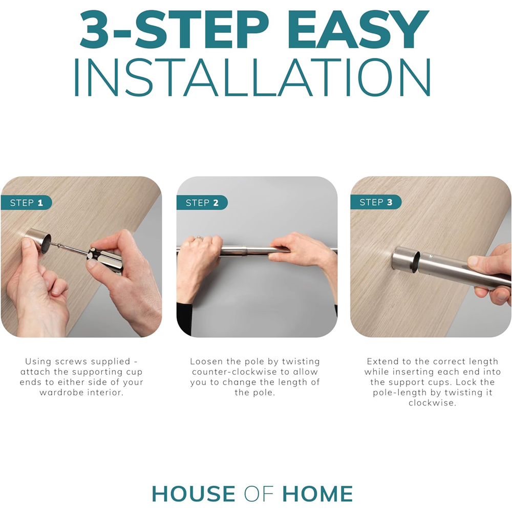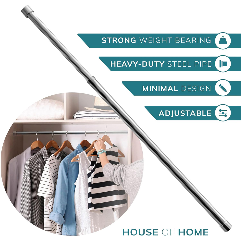Introducing the Extendable Wardrobe Rail, the ultimate solution for streamlined home organization. This steel wardrobe rail is designed with precision, featuring Perfect Grip Technology with two heavy-duty brackets and soft rubber grip ends to ensure a secure fit, preventing any wardrobe mishaps. Built to last, the extendable poles are manufactured with an extra thick metal sheet, capable of holding up to an impressive 40kg. Say goodbye to rust worries, as high-grade stainless steel keeps the rail smooth and shiny for the long haul. Installation is a breeze with two end brackets and seven screws, allowing for quick setup, and the extendable design adapts effortlessly to spaces between 34-53cm. This space-saving wonder is not only functional but also versatile, fitting seamlessly into closets, bathrooms, balconies, kitchens, and windows. Whether for clothes, curtains, or utensils, Perfect Grip is the key to a clutter-free, organized living space where style meets functionality.