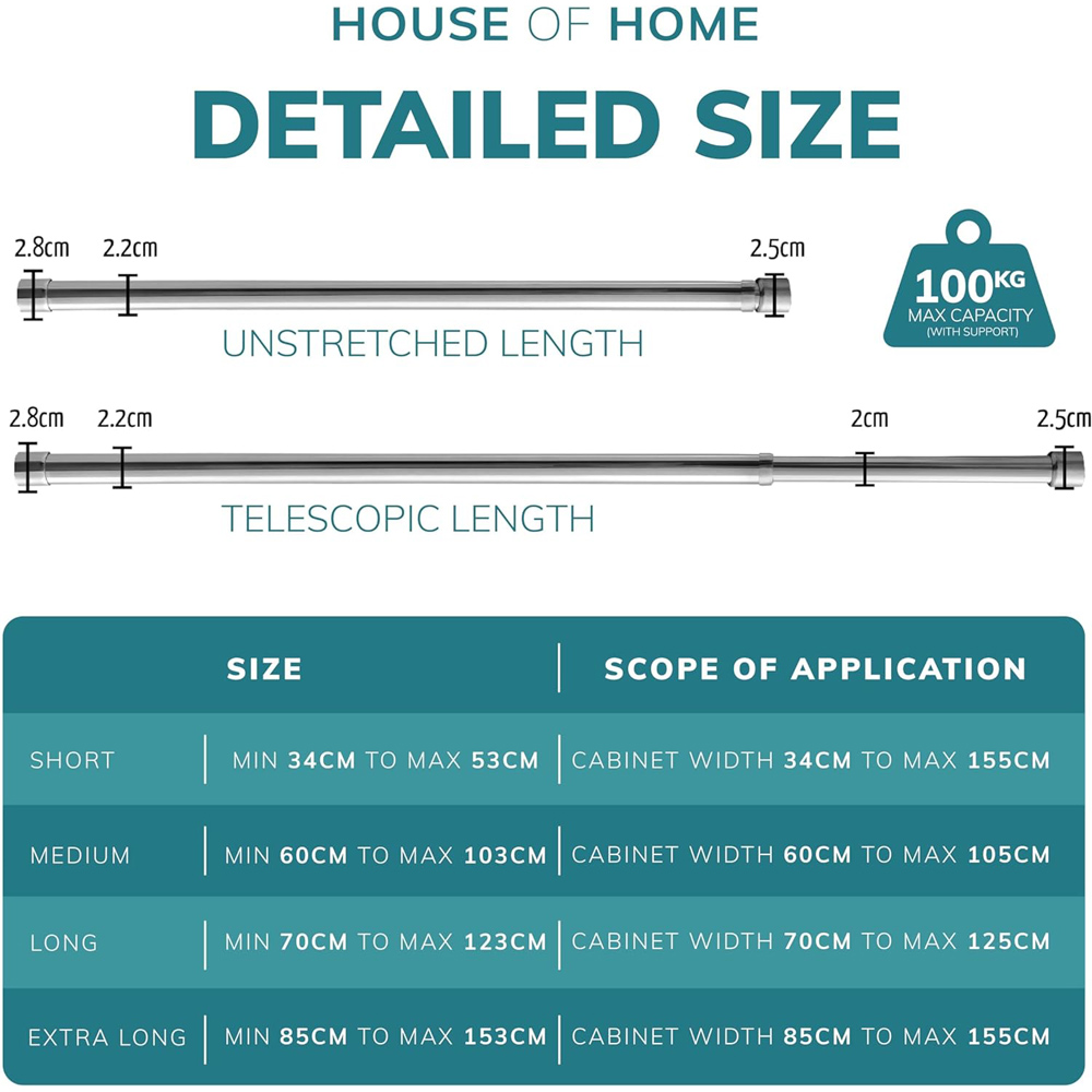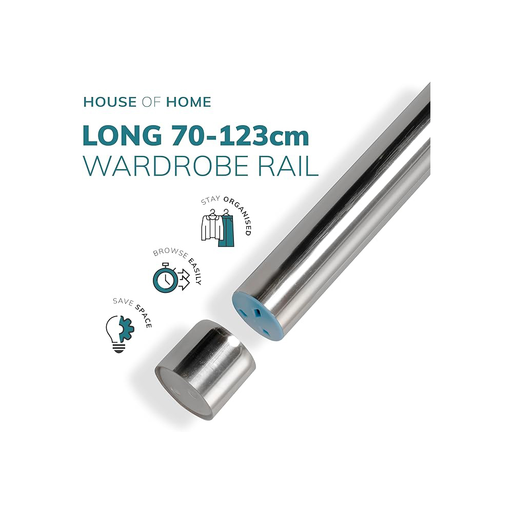 The House of Home Stainless Steel Extendable Wardrobe Rail is meticulously crafted with precision engineering, featuring two heavy-duty brackets and soft rubber grip ends that guarantee a flawless fit. These elements not only prevent the rod from slipping but also anchor it securely to walls, ensuring stability and reliability. Built to endure, the extendable poles for hanging clothes are constructed with an extra thick metal sheet, providing unmatched strength. With a remarkable capacity of up to 100kg when supported in the middle or 40kg without, Perfect Grip offers a robust solution for your storage needs. The use of high-grade stainless steel ensures resistance to rust, preserving the smooth and shiny finish for an extended lifespan. Experience hassle-free installation with the inclusion of two end brackets, middle support, and seven screws. The wardrobe pole is easily extendable and retractable with a simple twist, accommodating spaces between 70-123cm effortlessly. Save space and unlock endless possibilities as this adjustable wardrobe rod seamlessly fits into closets, bathrooms, balconies, kitchens, and windows. From hanging clothes to curtains and utensils, Perfect Grip is a versatile solution to transform any space into an organized haven. Upgrade your storage game with Perfect Grip – where strength meets style.