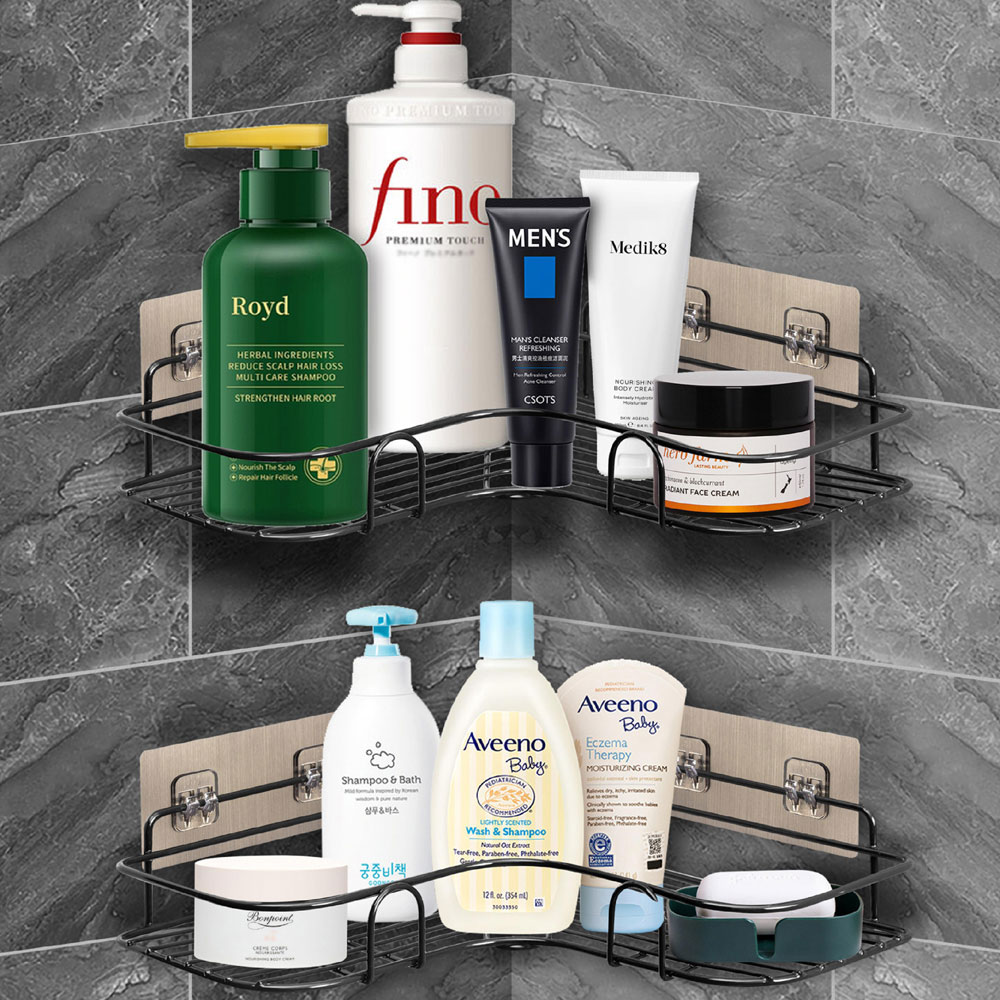 Store your bath essentials in one place with this pack of two House of Home Steel Corner Shower Shelves. These shelves are powder coated for rust resistance and better durability. Easy to install, the corner shelves come with adhesive back panels for effortless and reliable fixing. The set includes four self-adhesive wall-mounted plates and two shelves. Size: 37cm width x 12.5cm depth x 6cm height. Adhesive back plate size: 14cm width x 6.5cm height.