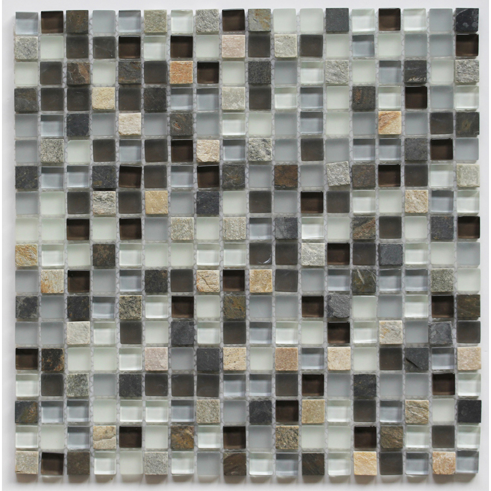 A timeless blend of quartzite stone and glass squares, in grey, brown and white tones, creating a classic look on any wall.