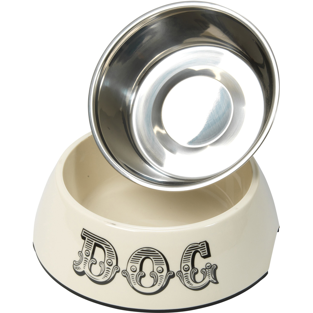 The House of Paws 2 in 1 dog bowl has a cream melamine bowl with DOG printed wording and also a stainless steel inner bowl. It's stylish in any kitchen and is dishwasher safe. The large capacity is 700ml. Size: 22 x 22 x 7.5cm.