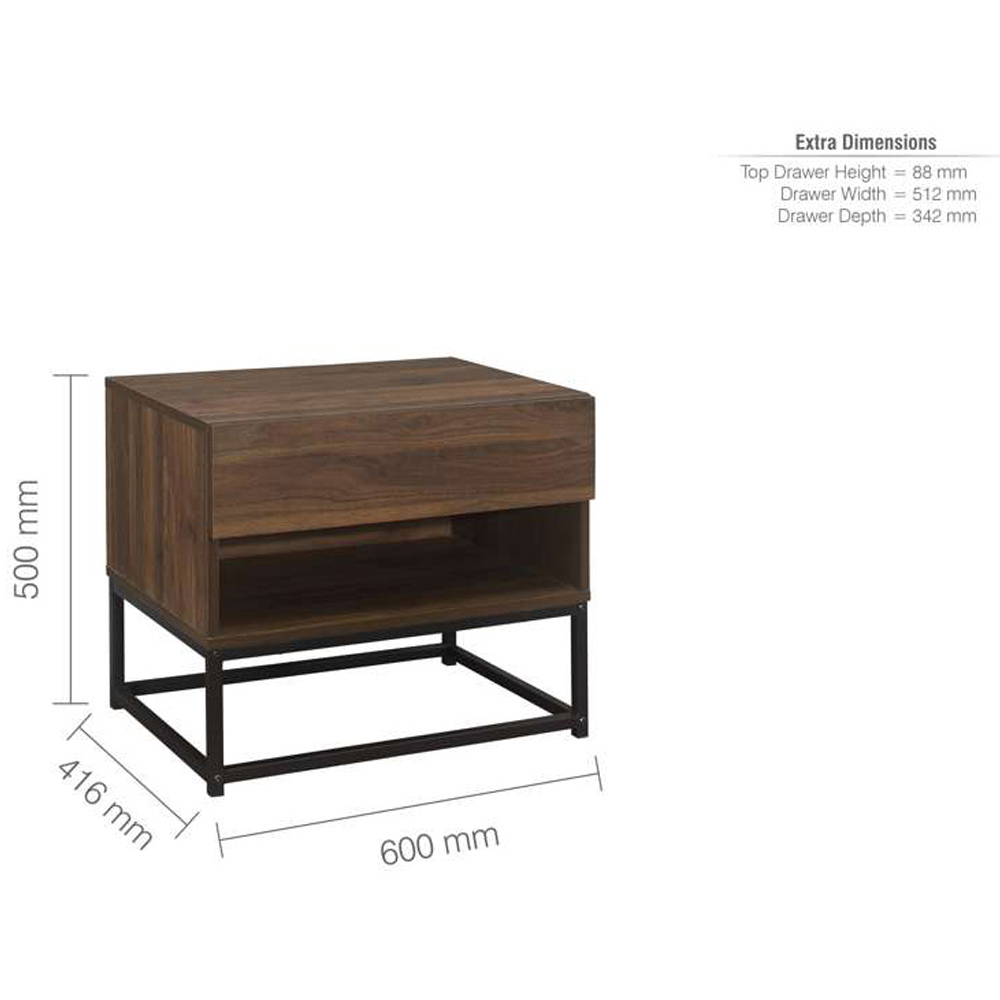 Make a classic addition to your bedroom decor with this Houston Bedside Table. Crafted from a metal frame with walnut-effect details and a wood-effect finish, it features a distinctive and modern style design inspired by modern architecture. With a single drawer and internal shelf space, this bedside table helps you to store your bed sheets or other night essentials. For a long-lasting shine, it is recommended to use a soft and dry cloth. With the metal frame stand this bedside table can give an elegant touch to your bedroom.