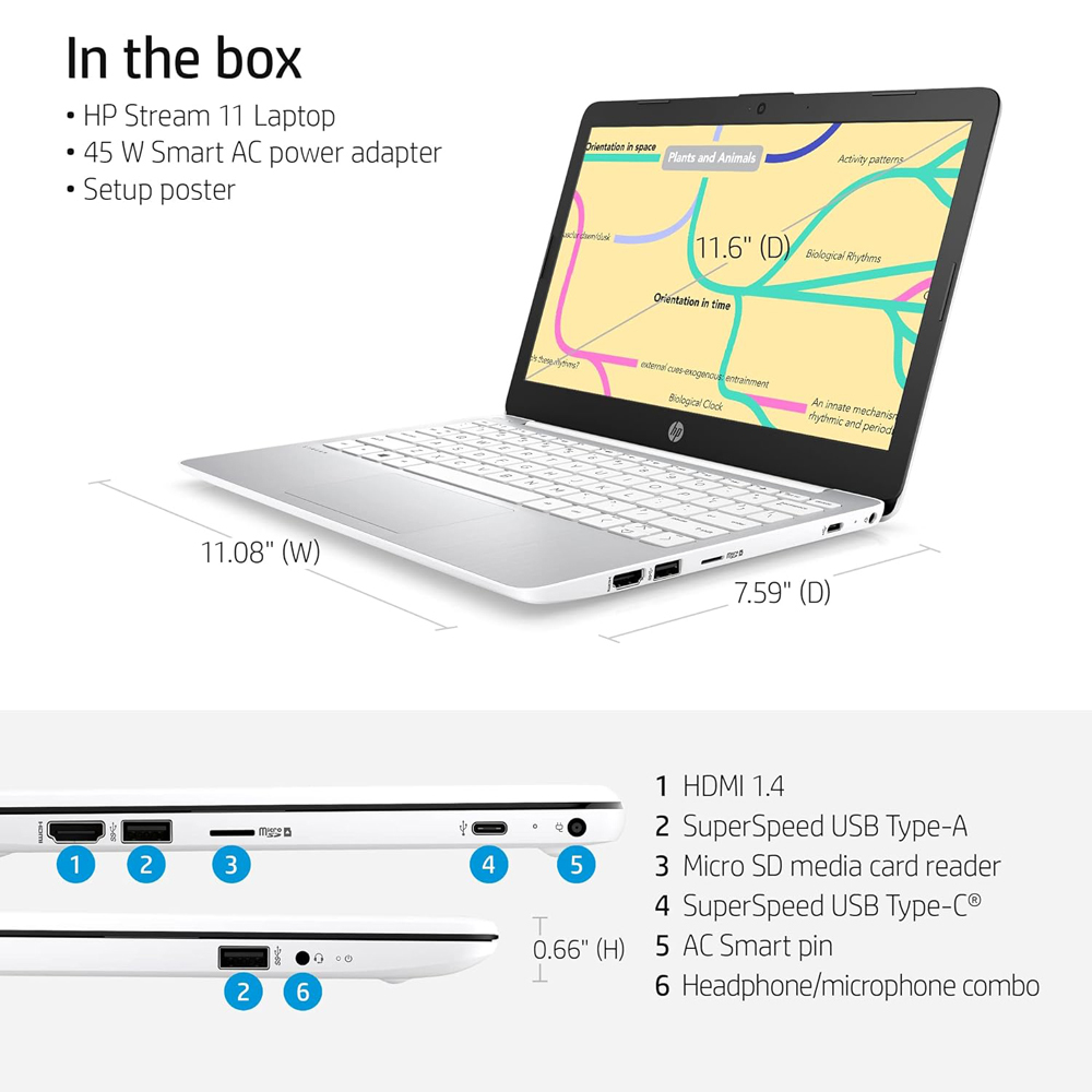 Handle your daily computing tasks with the HP Stream 11 Intel Celeron N4120 4GB Ram 64GB Storage Laptop White with Windows 11. It's powered by an Intel Celeron processor to help you manage everyday tasks like ordering groceries online, writing emails, and chatting with friends. This laptop showcases a lightweight and portable design to allow you to carry it with you wherever you go. It features Windows 11 S and 2- cell lithium battery that offers 13 hours of battery life. Practical and efficient, it has USB-C for fast-charging smartphones or tablets, USB ports to connect mouse and keyboard, and HDMI to stream Netflix on a non-smart TV. It also features built-in speakers, Bluetooth, a webcam, a 3.5mm jack, and a micro SD slot to provide you with a great experience. With 4 GB RAM and 64GB storage, it's a perfect partner for tackling all your daily computing tasks.