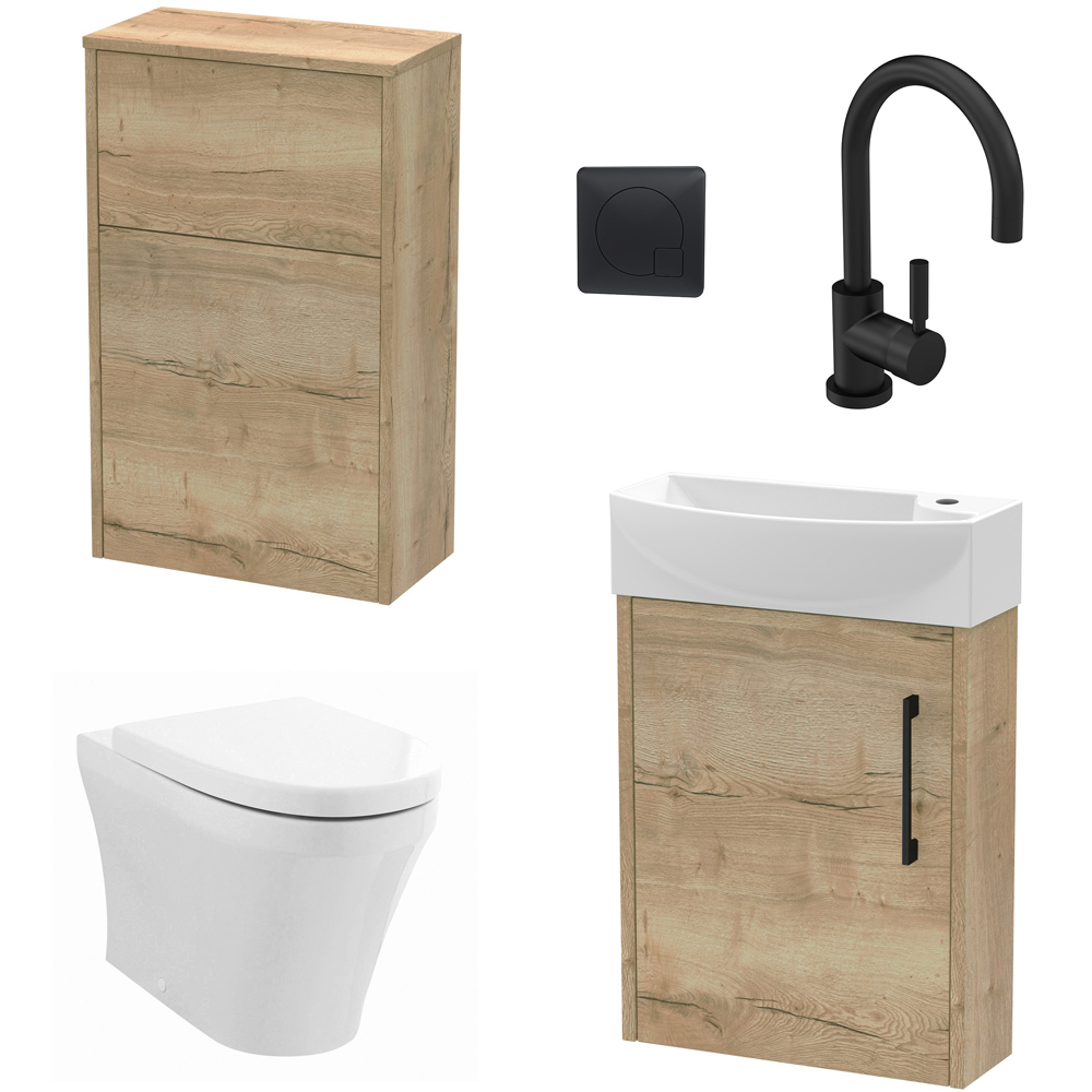Transform small bathrooms into modern spaces with a compact wall-hung WC and matching tap in a warm autumn oak finish, blending contemporary design and practical functionality for a neat and inviting look. Enjoy the ease of cleaning and a streamlined appearance that helps maximise your available space, while the soft-close seat adds a gentle touch to daily routines.