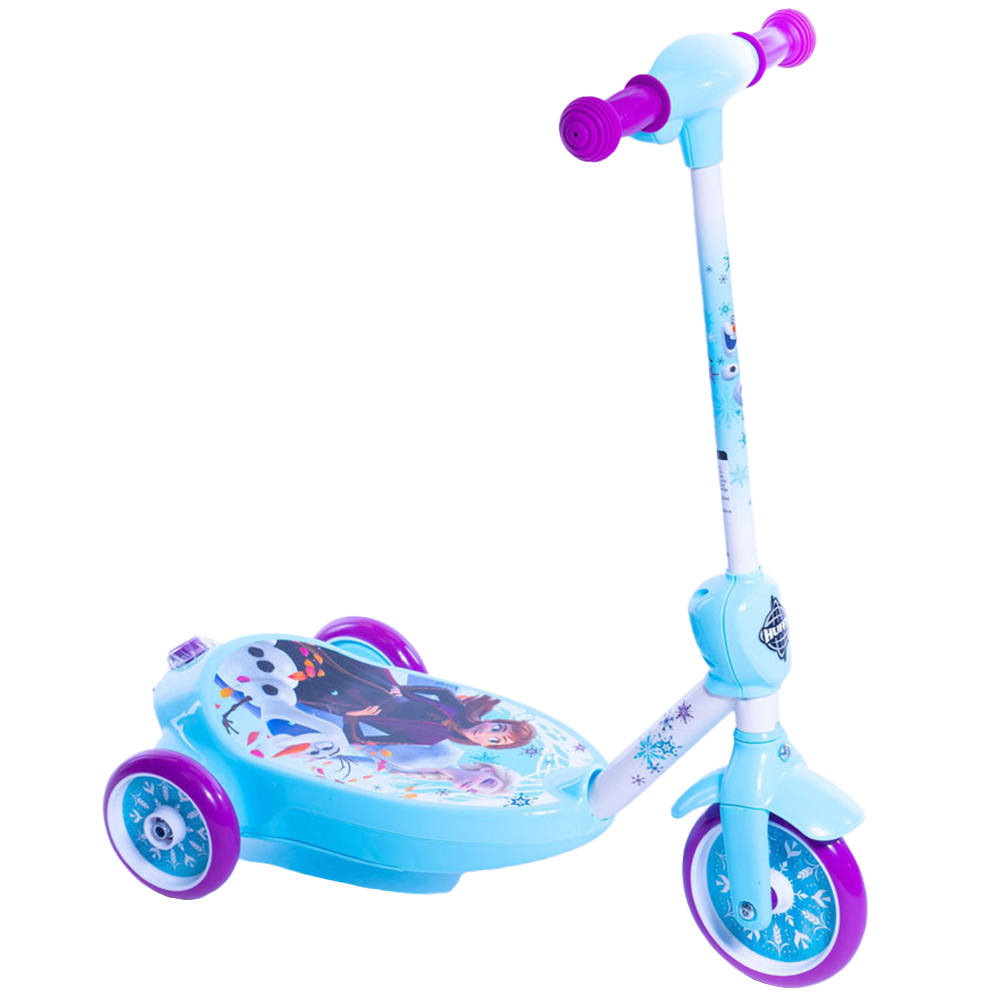 Disney Frozen 3-Wheel Electric Scooter Kid-Powered Bubble Scooter by Huffy Fun never seems to end! Make big smiles. Make lots of bubbles. Make plenty of fun memories while riding this Disney Frozen Electric Bubble Scooter by Huffy. Battery power for a smooth-riding ride. With battery power, simply press the red push button on the handlebar to start the ride. Plus, this Frozen electric scooter generates bubbles as they rides! This electric scooter travels forward and steers side-to-side. To keep the fun moving, a charger is included to easily power-up the electric ride on for the next adventure!