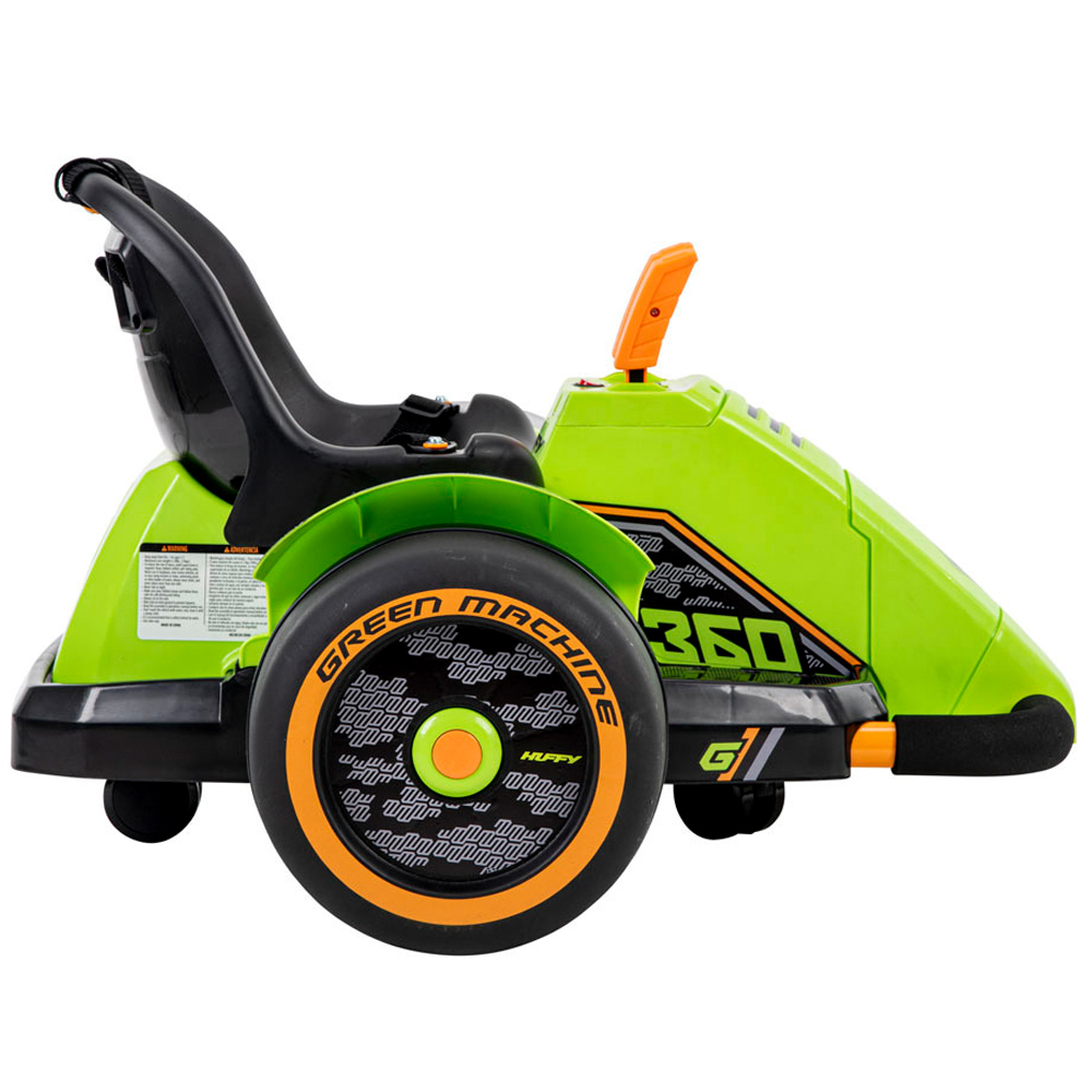 Every kid loves to ride and spin, and Huffy's Electric Green Machine 360 makes it so much fun. Designed for children between the ages of 3 to 5 years, the Green Machine 360 goes up to 4.0 kph. in forward and reverse. Your child will just love powering up and doing electric 360-degree spins. A dual stick throttle allows young riders to control the power and steering.