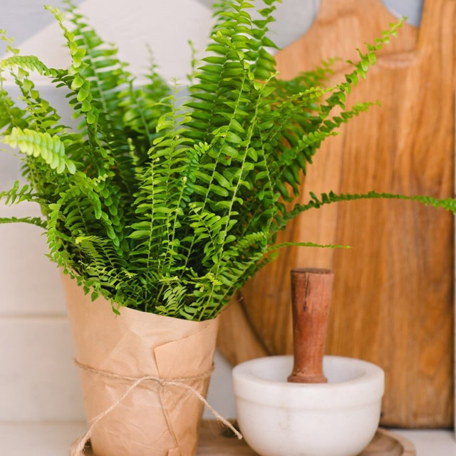 A Boston fern has fantastic foliage and is a fun addition to your home. Decorative and striking, its bright green leaves provide year-round colour and are especially fond of moist environments like your bathroom or kitchen.