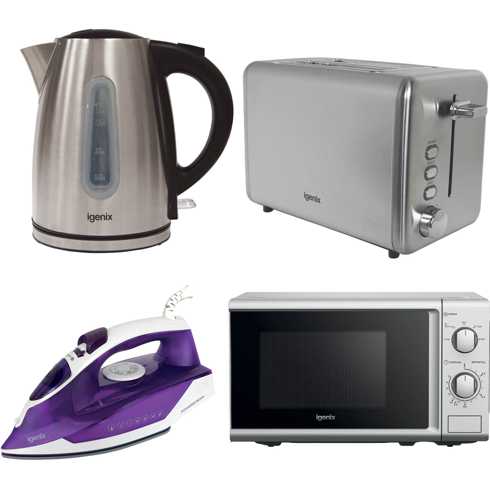 Transform everyday tasks with this smart and stylish Igenix bundle, featuring four versatile appliances designed to simplify your routine from breakfast prep to laundry refresh. The IG7251 1.7L cordless jug kettle, finished in sleek stainless steel, makes up to six cups in minutes with its powerful 3kW concealed rapid boil element. Designed for both performance and safety, it includes a locking lid, boil-dry protection and handy cord storage to keep your kitchen organised. Pair your perfect brew with golden toast from the IG3202 2-slice stainless steel toaster. With its blue illuminated controls and high-lift feature, you’ll never struggle to retrieve smaller slices. A slide-out crumb tray keeps things clean, while the built-in defrost function lets you toast bread straight from the freezer—ideal for busy mornings. Need quick, convenient cooking? The IGM0820S 20L manual microwave has you covered. Simple dial controls and five power levels—including defrost—offer up to 800W of heating precision. A generous 255mm turntable accommodates everything from bowls to plates, and the 35-minute countdown timer makes mealtimes fast, easy and fuss-free. Finally, the Igenix Power Steam iron delivers professional-grade results with effortless control. Featuring a powerful 2200W output, continuous steam, and a ceramic soleplate that glides smoothly over fabrics, it handles stubborn creases with ease. With a 250ml tank, vertical steam, anti-drip and anti-calc functions, plus a self-cleaning system and thermal cut-out safety protection, it’s designed to help you press and refresh with confidence. Together, this coordinated Igenix set blends smart design, practical features and modern stainless steel finishes—bringing convenience, consistency and a touch of style to every corner of your home.