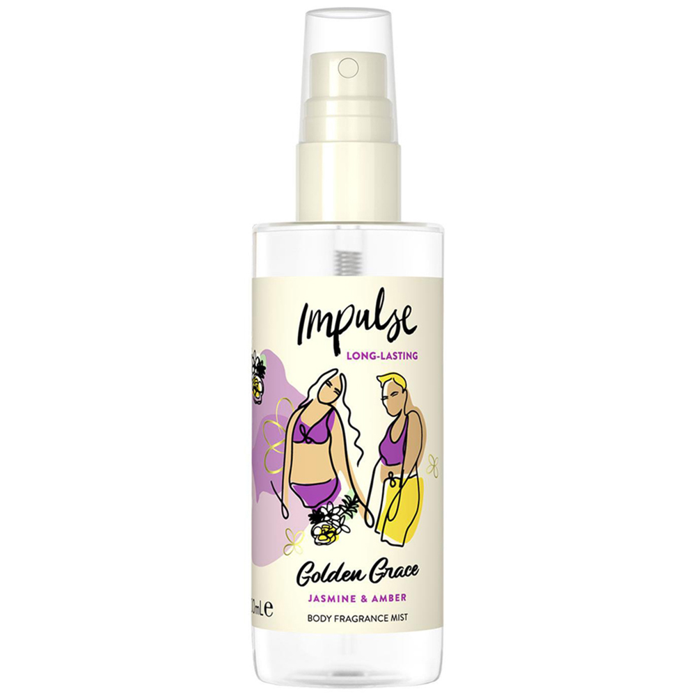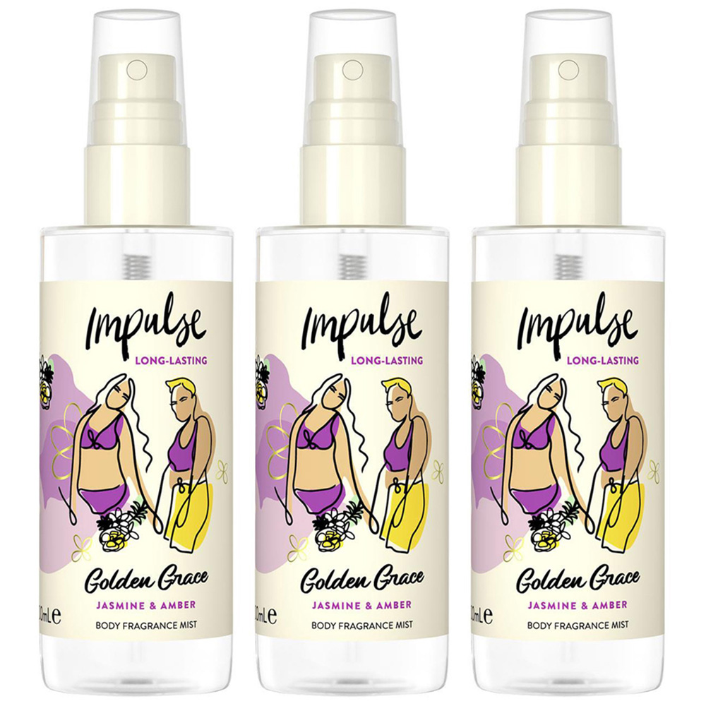 Impulse Golden Grace Body Mist with Jasmine and Amber Fragrance 100ml, 3 Pack. Inspired by vivid, radiant jasmine and woody amber, this body fragrance is like a floral elixir for the senses. Discover the scent station of Impulse Body Mist, like a floral elixir for the senses with vivid, radiant jasmine and woody amber, this body fragrance. Pop the top and spray the body mist impulsively where you want it when you want it. This handy 100 ml size spray is perfect to put in your bag, on top of your cupboard, anywhere really. Magnetise your aura with the floral fragrance mist leather a refreshing body spray for women who exude confidence. Trust Your Impulse and discover your favourite range of spray body mists from Impulse you'll also vibe with these Body Mists.