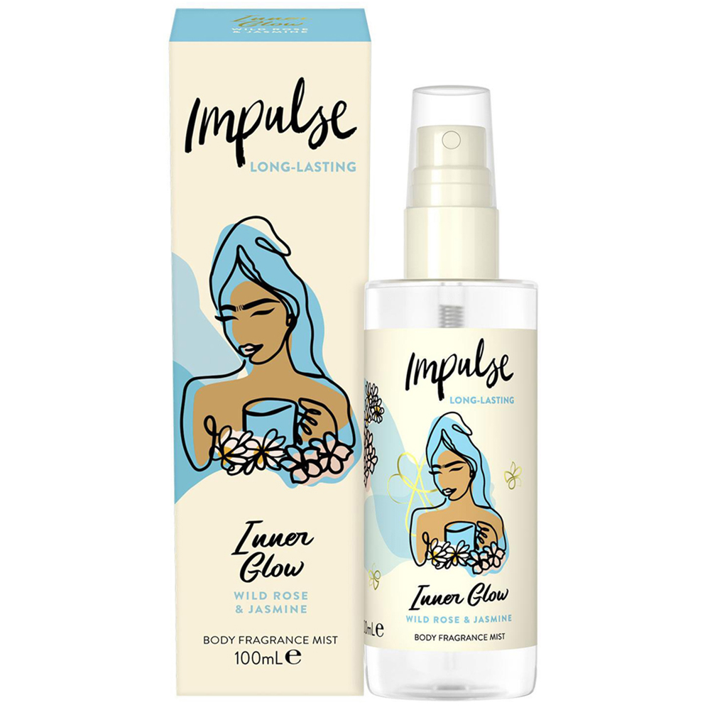 Impulse Inner Glow Body Mist with Wild Rose and Jasmine Fragrance 100ml, 3 Pack. With a floral cocktail of delicate jasmine and wild rose accords, this body fragrance provides a sophisticated lift that will whisk you off your feet. Discover the scent station of Impulse Body Mist, which provides a sophisticated lift that will whisk you off your feet with a floral cocktail of delicate jasmine and wild rose accords. Pop the top and spray the body mist impulsively where you want it when you want it. This handy 100 ml size spray is perfect to put in your bag, on top of your cupboard, anywhere really. Magnetise your aura with the floral cocktail fragrance mist leather a refreshing body spray for women who exude confidence. Trust Your Impulse and discover your favourite range of spray body mists from Impulse you'll also vibe with these Body Mists.