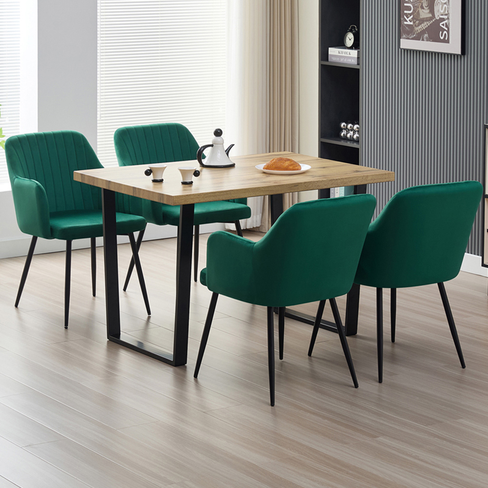 Induce elegance to your dining room with the Indoor Living Colorado Charlotte 4 Seater Dining Set Green. This contemporary and sleek Dining Set features a natural tabletop with geometrical matte black metal legs. It is paired with four black Charlotte chairs with curved armrests, completing the luxurious look. The chairs are crafted from high-quality velvet material, featuring sleek stitched lines and sturdy metal legs with a matte black finish. This dining and chair set gives your dining area a transformed modern vibe, enhancing its appeal. It is the perfect addition to your space for hosting guests and family dinners.