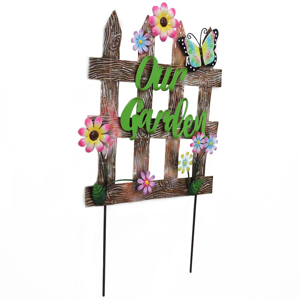 The Indoor/Outdoor Our Garden Sign is perfect for adding colour and style to your garden. The sign can be staked into your garden and is crafted to look like a traditional fence panel accented with colourful flowers and a butterfly, and is finished with the words 'our garden' in the centre. Perfect for indoor and outdoor use, it's sure to make your space feel modern and whimsical.
