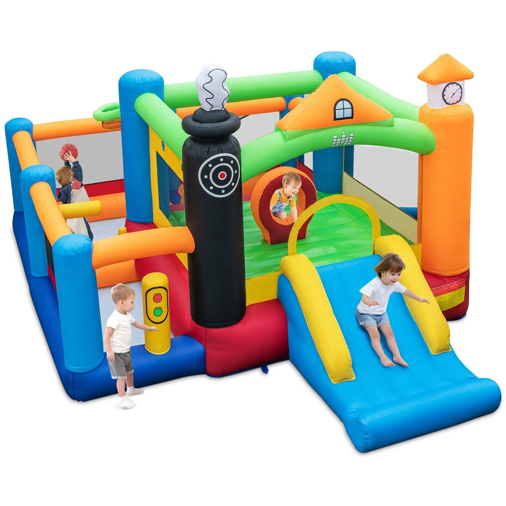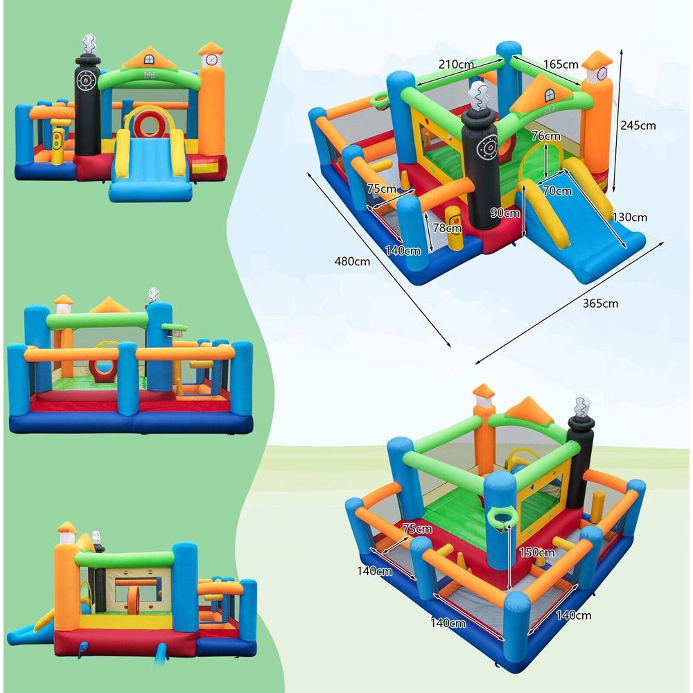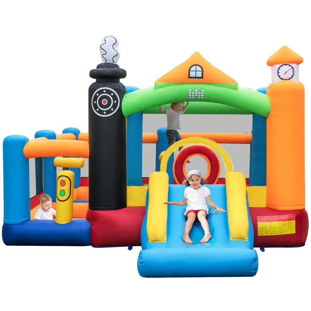 Brighten up your garden with the Costway Kids Inflatable Train Themed Bounce Castle. This delightful bounce house boasts a range of activities, from a thrilling slide to a fun basketball hoop, ensuring kids have endless entertainment options. Safety is paramount, with see-through mesh walls and slide guardrails providing secure play areas. The setup is straightforward, allowing for quick assembly and easy storage, ensuring it's ready for action whenever you are. It's not just fun but also built to last, crafted from durable and puncture-proof materials, making it a perfect gift for any occasion and a wonderful addition to both indoor and outdoor spaces. Please note: The blower is not included, and the recommended power is 950W.