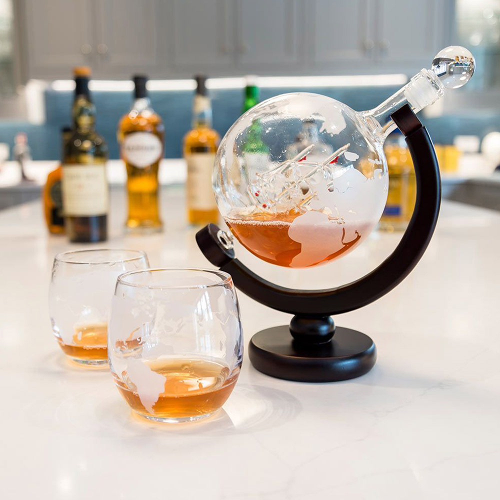 Serve with elegance and sophistication with the exquisite Ingenious Globe Decanter with 2 Glass Set. Crafted from high-quality glass, this stunning decanter is adorned with detailed markings of the continents, transporting you to distant lands and adventures. Resting in a beautifully designed wooden cradle, the decanter can be gently spun with a touch of your hand, adding a touch of whimsy to your serving experience. At its heart lies a meticulously crafted glass ship, capturing the spirit of exploration and discovery. Complete the set with two matching tumblers, each featuring intricate map markings, to elevate every sip into a journey of its own. This classic and timeless decanter set is a true testament to the art of fine craftsmanship and an essential addition to any discerning connoisseur's collection.