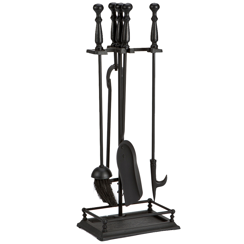 Make a stylish and practical addition to your fireplace with the Inglenook Fireside Black Fireside Companion Set. This companion set is crafted using heavy-duty cast iron with subtle and easy-grip chrome finish handles. This sturdy five piece set includes a hearth brush, a coal shovel, a fire poker, a pair of tongs and a storage stand. This compact set helps in keeping the hearth clean while maintaining the fireplace. It comes with a storage stand that fits neatly near the fireplace without taking up too much space. This set is easy to assemble, just tighten the screw on the base and it is ready to hold all your fire accessories.