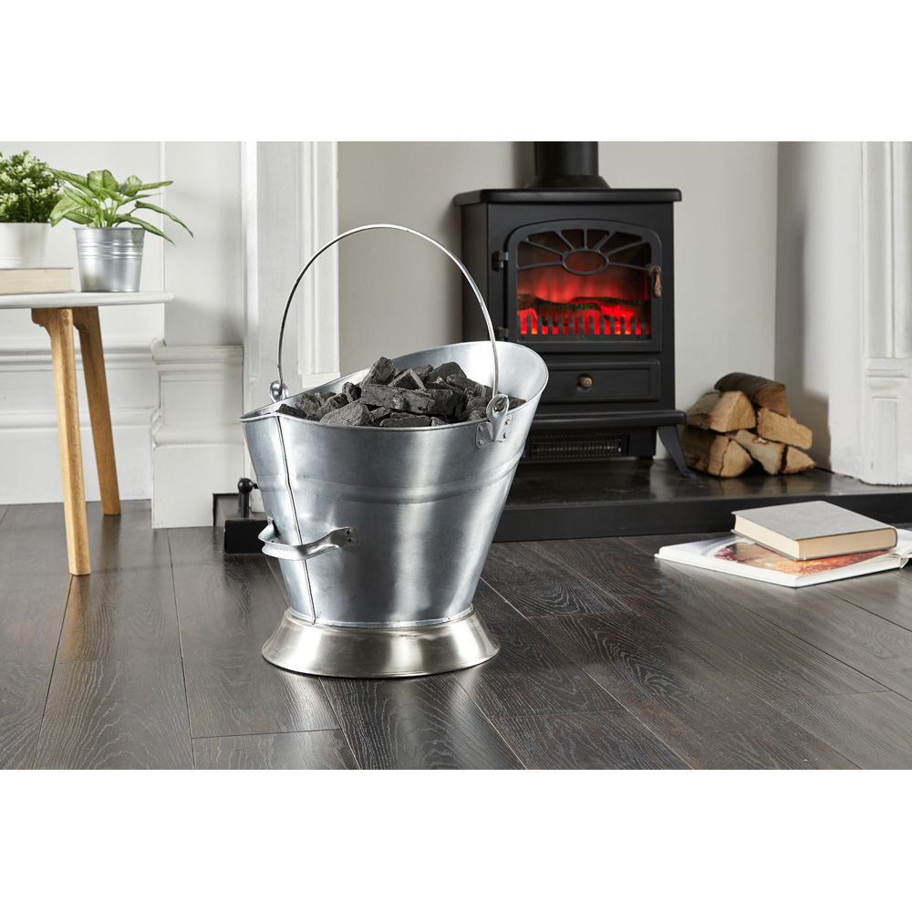 Enhance the traditional charm of your living space with the Inglenook Fireside Galvanised Waterloo Coal Bucket. This metal coal bucket serves as a necessary and stylish accessory for storing coal conveniently. Measuring 37 x 37 x 29cm, it offers ample space to organise your coal, logs, or fireside tools in an orderly manner. Equipped with two sturdy handles, this coal bucket is effortlessly portable and easy to empty. Its wide base prevents any accidental spills, while the heavy-duty steel construction guarantees its durability for long-term use. Cleaning is a breeze, simply wipe down the bucket when it has cooled.