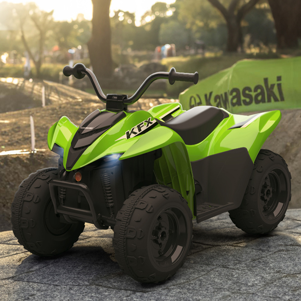 Ignite a love for outdoor adventure as children experience the thrill of a Kawasaki-inspired ATV, designed to look and feel just like the real thing with sporty green styling, LED headlights and intuitive controls. Built for ages three and up, this 12V kids electric quad bike with safety features lets young riders cruise at a safe speed while learning balance and coordination, thanks to a stable wide base and large wheels. Parents can rest easy knowing the electric brake ensures smooth stops, and with a rechargeable battery and charger included, kids can jump straight into action on their children’s green ride on quad bike with parental control.