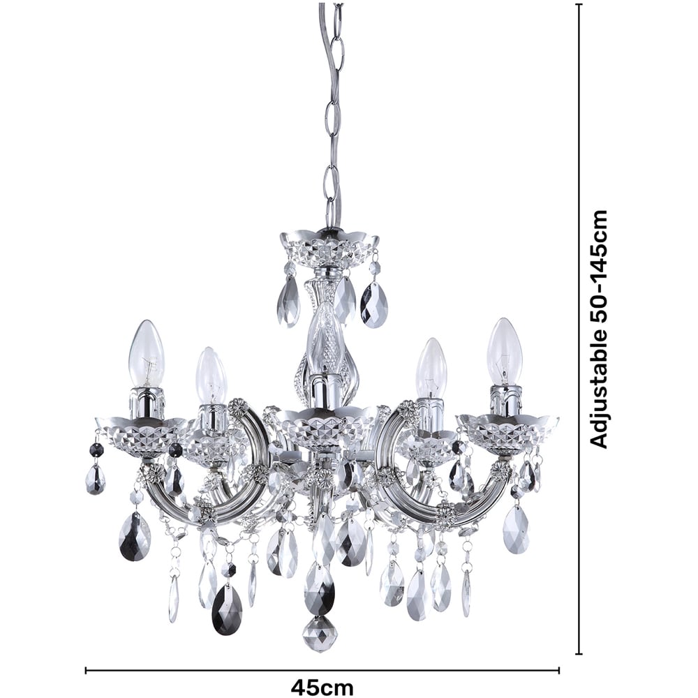 Elevate your home decor with the timeless elegance of the Inlight Marie Therese 5 Light Chandelier in Silver. This stunning chandelier features gracefully curved arms, delicate crystal-effect droplets, and a sleek silver finish that adds a touch of luxury to any space.