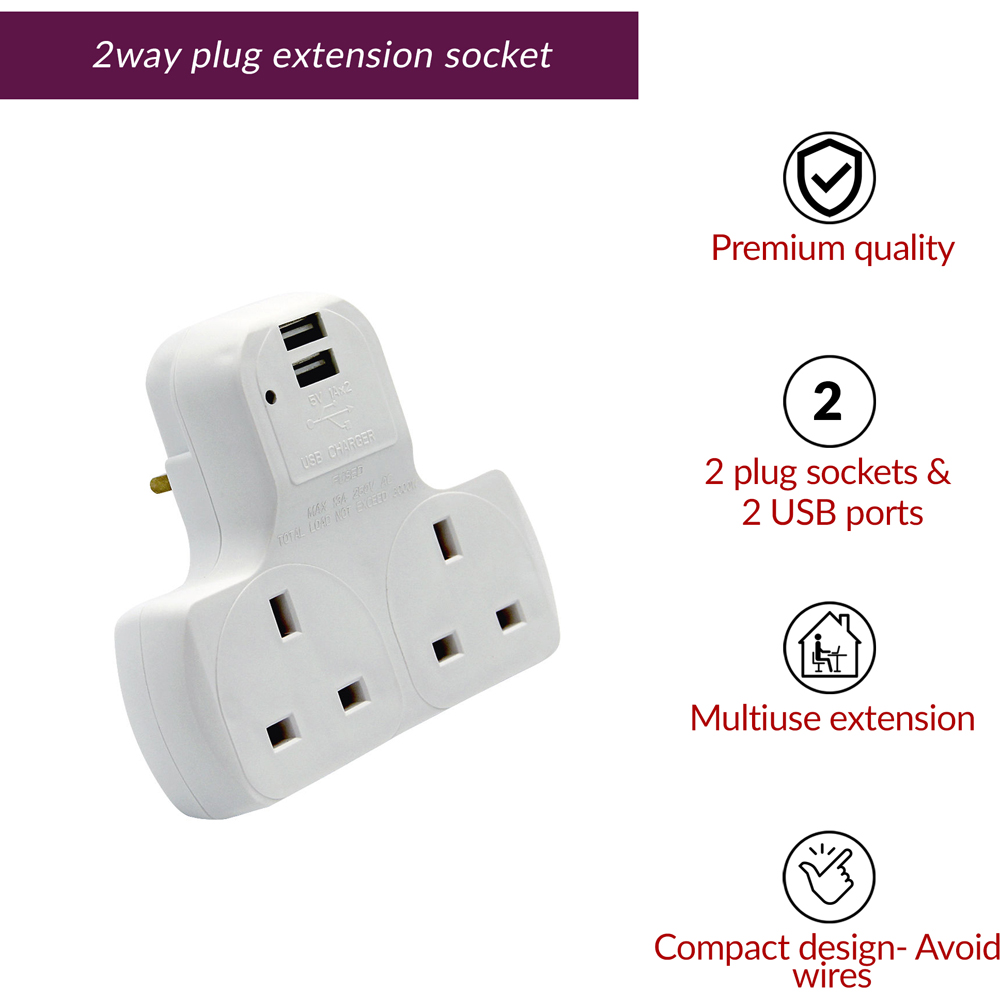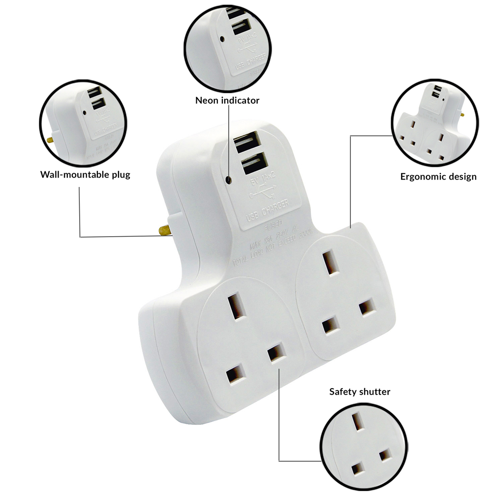Innoteck 2Way Multi plug adaptor 13A UK mains socket outlets with 5V 2.0A Max Dual USB charging ports.