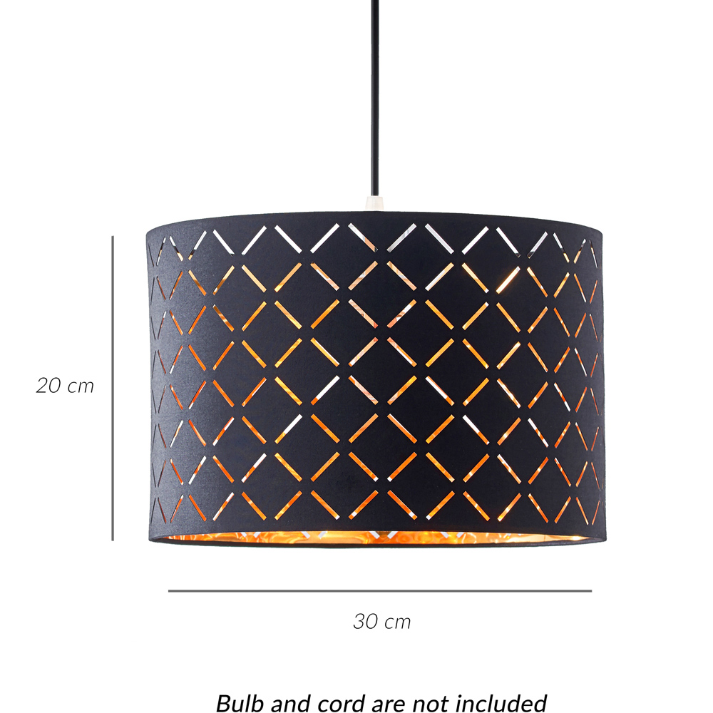 Innoteck decorative pattern light shade and a cut out design. Outer neutral fabric and a warm golden inner reflective film for the perfect light glow. This drum shaped lamp shade is suitable for any room within your home. Compatible with E27 and E14 lamp holders. Light fittings and bulbs not included.