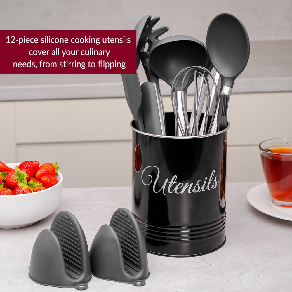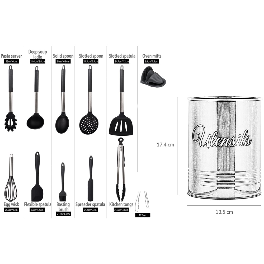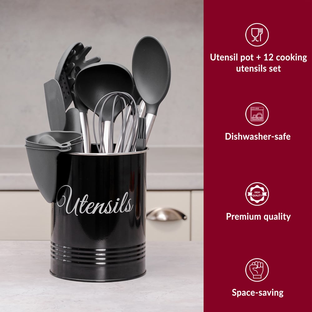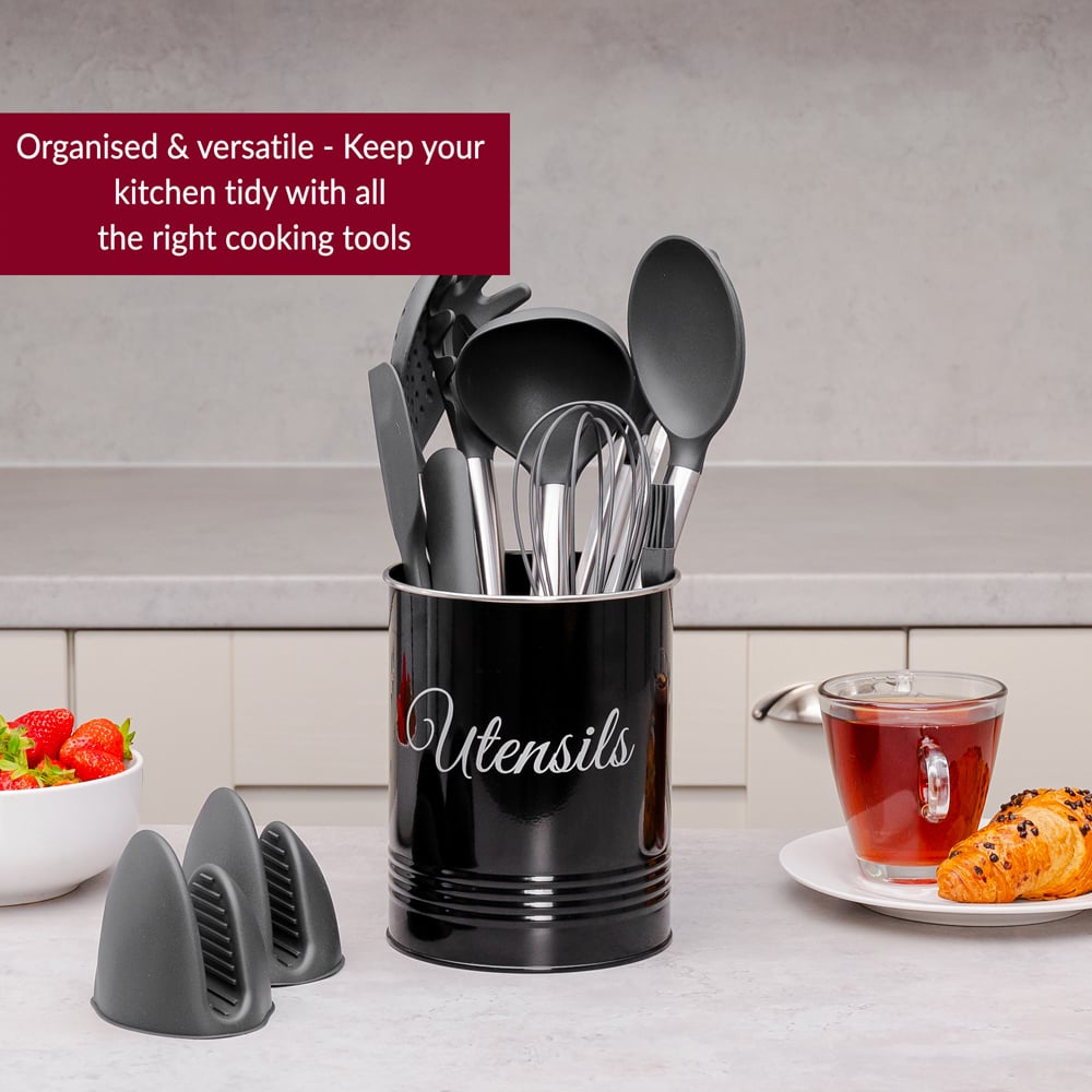 Innoteck Essentials Metal Utensil Crock Holder complete with 12 silicone utensils. - The Metal Utensil Crock Holder is a versatile and stylish kitchen accessory that combines functionality and aesthetics. It serves as a farmhouse-inspired countertop decor piece while providing ample storage space for the silicone spoons, spatulas, whisk, pasta server, ladle, tongs, and basting brush that are included. With its sturdy construction and multi-purpose design, this utensil pot offers a convenient and organized solution for keeping your kitchen essentials within easy reach. Designed to withstand the rigours of daily use, the Metal Utensil Crock Holder is built with high-quality metal. The durable construction ensures its longevity and resistance to rust, corrosion, and other forms of damage. All of the cooking utensils are dishwasher-safe. The set includes 1 black utensil holder along with 12 pieces of high-end silicone utensils - slotted spatula x1, slotted spoon x1, deep soup ladle x1, pasta server x1, solid spoon x1, Kitchen tong x1, basting brush x1, flexible spatula x1, spreader spatula x1, egg whisk x1 and silicone oven mitt x2.