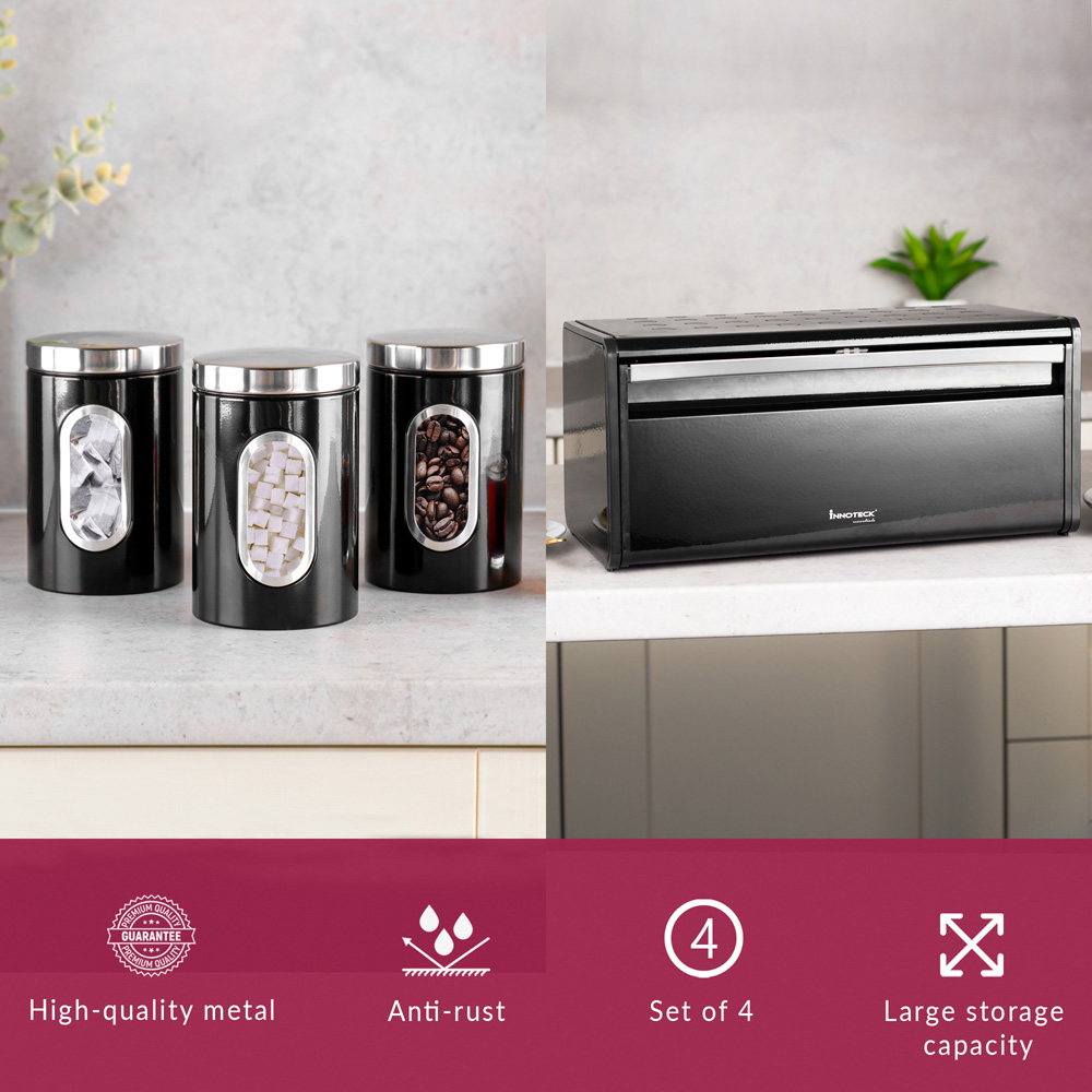 This kitchen Innoteck Essentials 3 Piece Black Canister Set includes a spacious bread bin and canisters for a sleek kitchen. A must-add to your kitchen accessories, this stylish bread bin keeps your loaves fresh and your countertops clutter-free. The three matching canisters are perfect for storing everything from coffee and sugar to pasta and rice. This set is a game-changer for those who love a tidy, well-organised kitchen. As part of your kitchen essentials for a new home, this set does double duty as both storage and decor. The sleek, contemporary design complements any kitchen style, from farmhouse chic to ultra-modern.