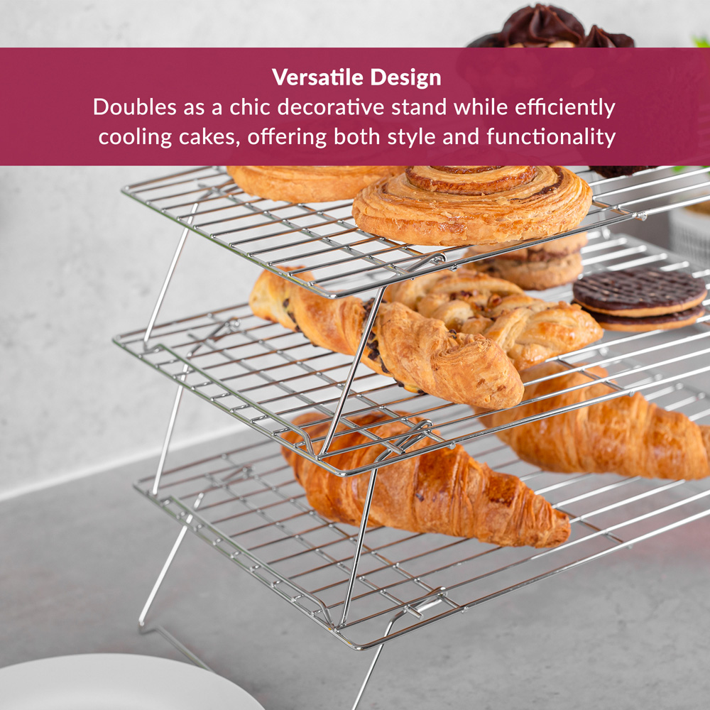 This Innoteck Essentials 3-Tier Stackable and Foldable Cake Cooling Rack is the perfect companion for every baking enthusiast and professional pastry chef. Crafted with precision, this cooling rack is designed to elevate your baking experience. The three-tier cake cooling rack boasts a premium construction that ensures longevity and resilience. The sturdy frame provides a stable foundation and support needed for your delicate creations. Maximise your kitchen space with the innovative structure of our cooling rack. Perfect for cooling multiple cakes, cookies, or pastries simultaneously, it eliminates the need for juggling between batches on your countertop. With an open-grid design, it provides proper air circulation ensuring even cooling, preventing the frustration of unevenly cooled cakes, and eliminating the risk of soggy bottoms.
