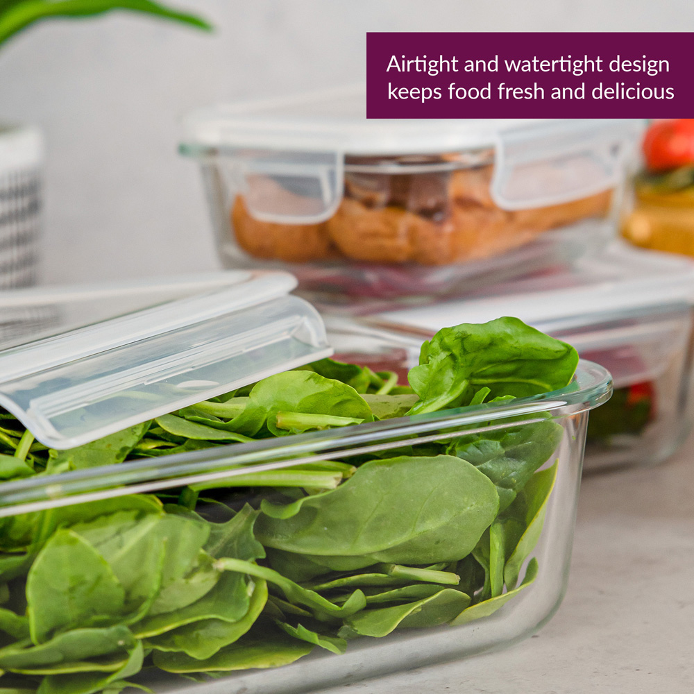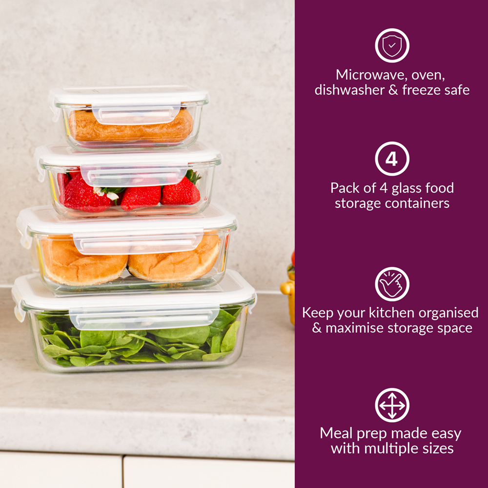 Innoteck Essentials glass food storage set comes in 4 different sizes that are oven, microwave, freezer, and dishwasher safe. Durable and hard-wearing they are made to last. Stack the rectangular tubs one on top of the other for neat and tidy kitchen storage or easy meal organisation in the fridge or freezer. Carry these glass food containers during your picnic and level up your meal-prepping skills. This premium 4-pack food storage glass container with Air Seal and leakproof lids so will make it easier to prepare your daily dinner. The set comes in a variety of sizes, making it ideal for food prep, office lunches, ready-to-eat meals, portion control, and so on.