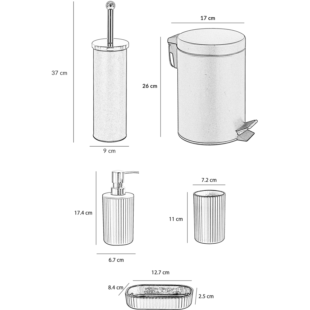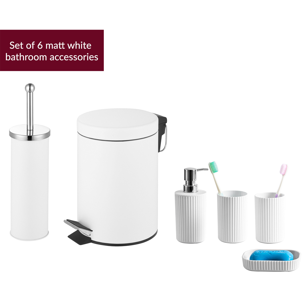 Innoteck Essentials bathroom set is crafted from matt white coated metal and plastic. It adds not only a touch of modern elegance to any space but also boasts remarkable durability, ensuring it's the perfect fit for any bathroom. The Pedal Bin allows you to dispose of waste without touching the surface of the bin, promoting cleanliness and hygiene. The toilet brush comes with a specifically designed compact holder that allows for easy and space-saving storage. The handle is ergonomically designed to provide a comfortable and secure grip during use. This allows for effective cleaning without causing strain or discomfort to the users' hands. Soap Dispenser: Enjoy the convenience of a sleek soap dispenser that adds a touch of elegance to your sink or countertop. Effortlessly dispense your liquid soap with a simple press, promoting a clean and hygienic handwashing experience. Toothbrush Holder- Keep your toothbrushes within easy reach with the dedicated toothbrush holder. Its smart design ensures proper ventilation, promoting optimal hygiene by preventing water buildup and bacterial growth. Soap Dish- The included soap dish provides a dedicated space to keep your soap dry and well-placed. The sleek design not only adds a decorative element but also ensures your soap stays in optimal condition.