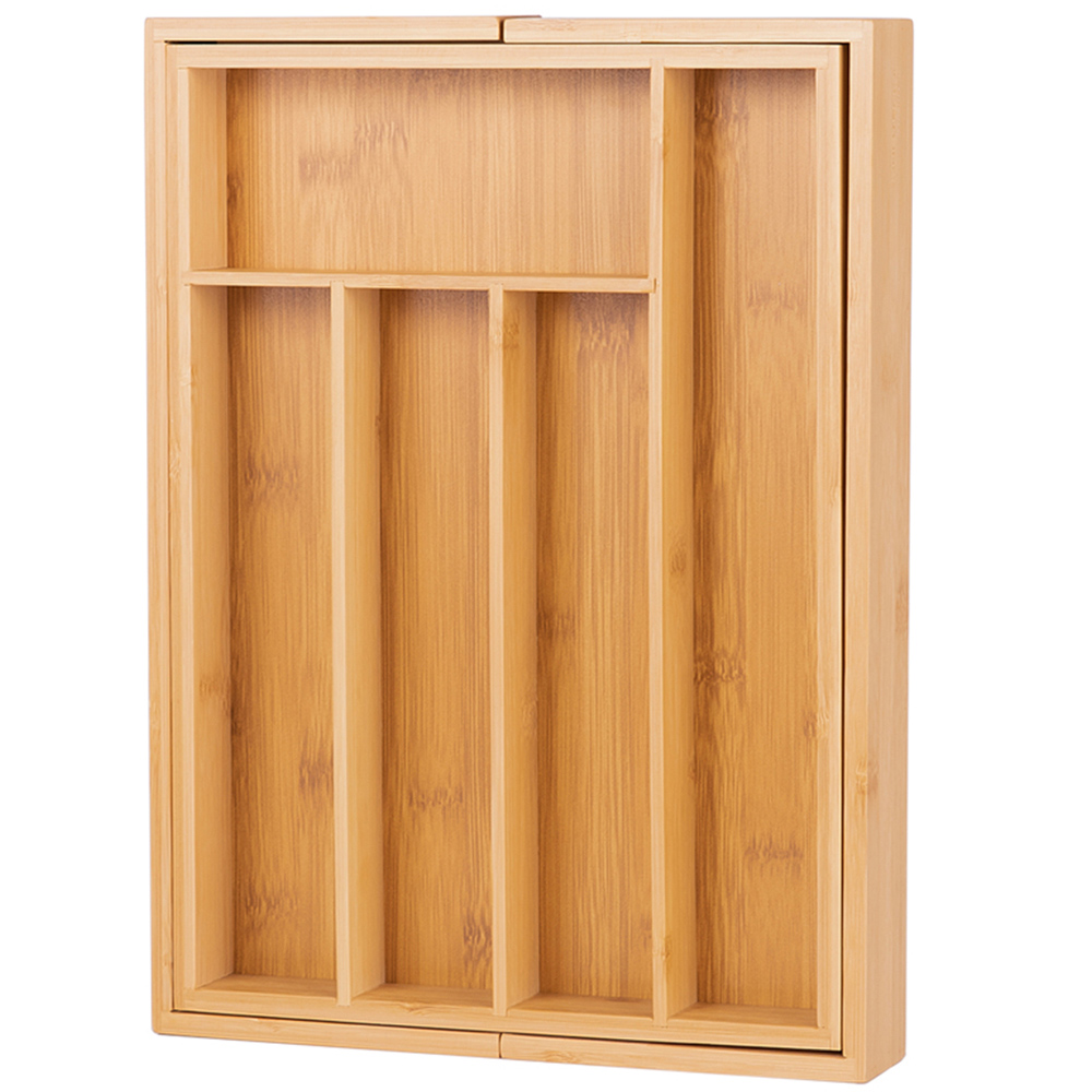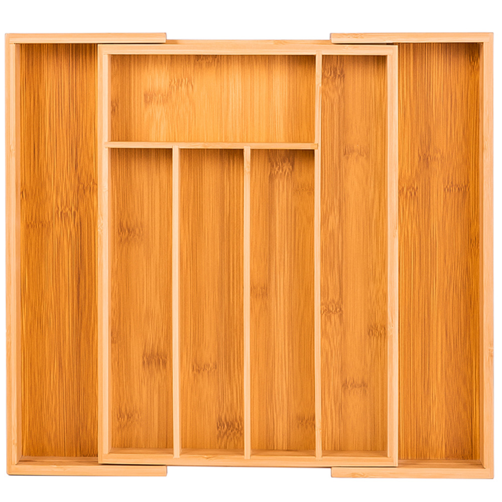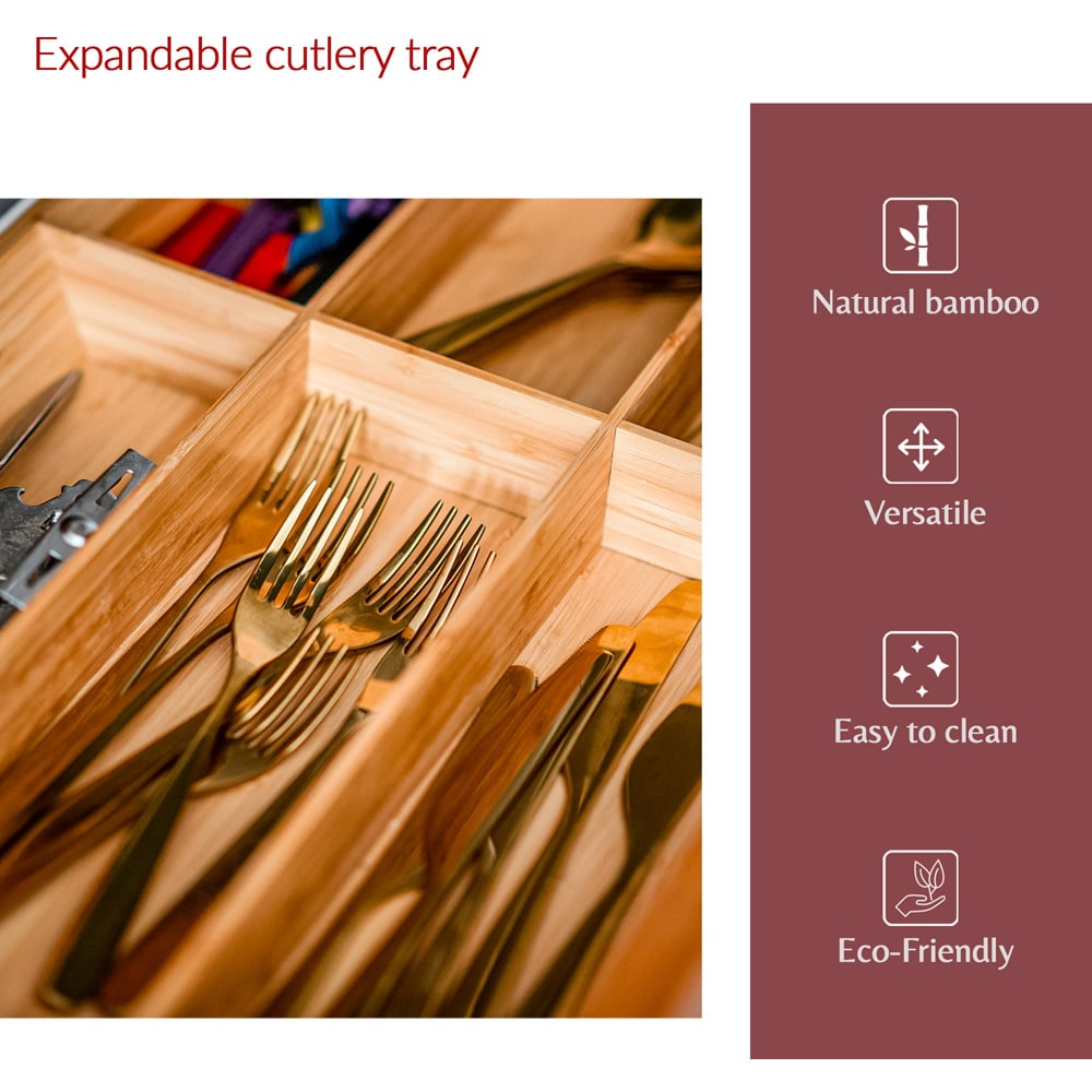 Innoteck Essentials natural bamboo expandable cutlery tray with 5-7 compartments boasts a practical design that makes storing utensils and cutlery a lot easier. You will have designated storage space for all your cutlery in our cutlery tray. Everything fits perfectly without getting jumbled up - forks, spoons, spatulas, scissors. Perfectly sized to fit into your drawers. This handy organiser can also be used as a desk tidy to store all of your stationery items, jewellery or other items. Keep the things that matter to you in a safe, neat and tidy way. Helping to keep your kitchen organised and your drawer clutter-free, the compartments cutlery tray is perfect for keeping your tableware safely stored. Lightweight and durable, the cutlery tray is perfect for all kitchen drawers.