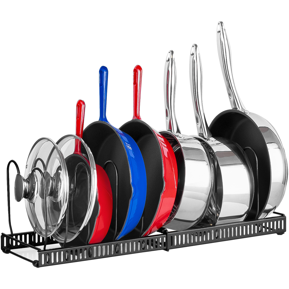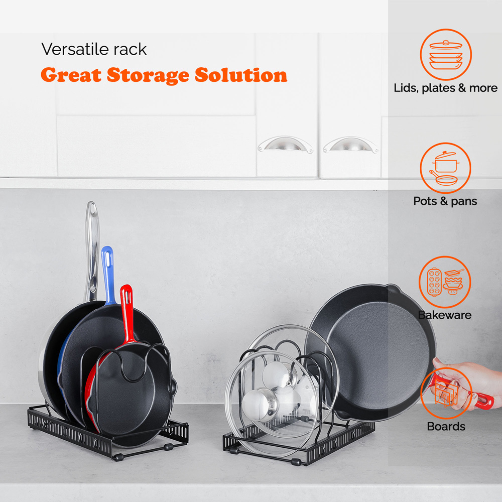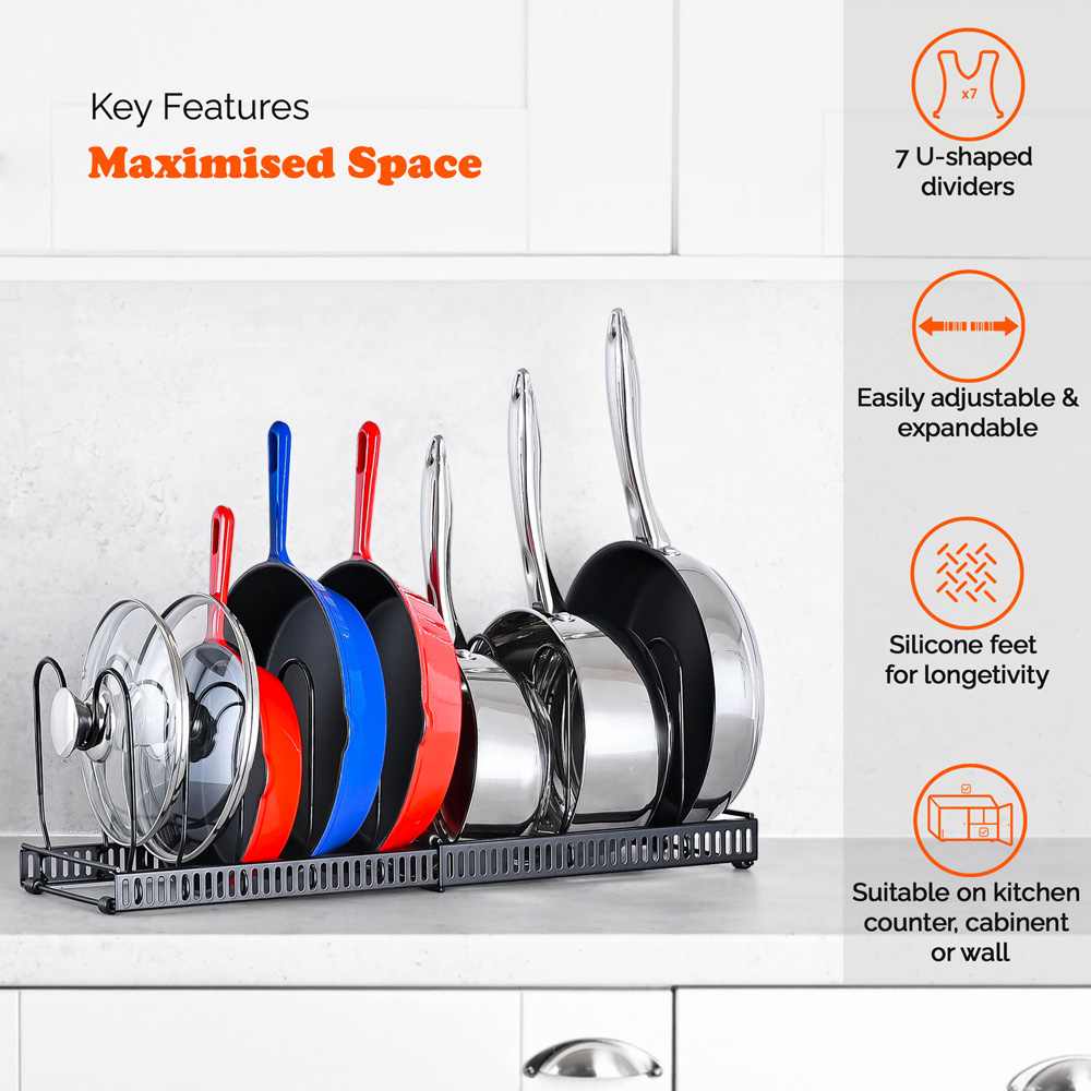 This Innoteck Essentials Black Pan Organiser Rack will streamline your kitchen organisation, maximise cabinet space, and make your pots and pans more accessible. It not only tidies up your kitchen but also contributes to a more efficient and enjoyable cooking experience. The dimensions of our pan rack are carefully considered to fit neatly inside most standard kitchen cabinets. This means you can store your pots and pans in a way that keeps them organised and out of sight, helping you maintain a tidy and clutter-free kitchen. With pan rack, each pan has its dedicated slot, ensuring they are neatly separated. This not only enhances the visual appeal of your kitchen but also reduces the risk of accidentally scratching or damaging your cookware. Instead of just having one rack for storage, you can have two, This design allows for easy switching between using one rack inside your cupboard and keeping the other on your countertop. This flexibility is particularly useful in situations where space is limited or where you might want to alternate between storing items in a cupboard and having easy access to them on the countertop for convenience.