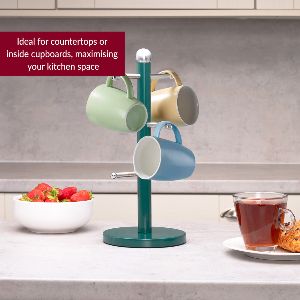 This Innoteck Essentials Green Stainless Steel Mug Tree with six hooks comes with a glossy green coated pole and base. It features six stainless steel branches with small end stops and a chrome ball on to stop your cups rolling off the tree. The weighted base keeps the stability of this stand even when holding six cups at one time. Easy to clean with a damp cloth or sponge so you can keep the kitchen counter top neat and tidy.