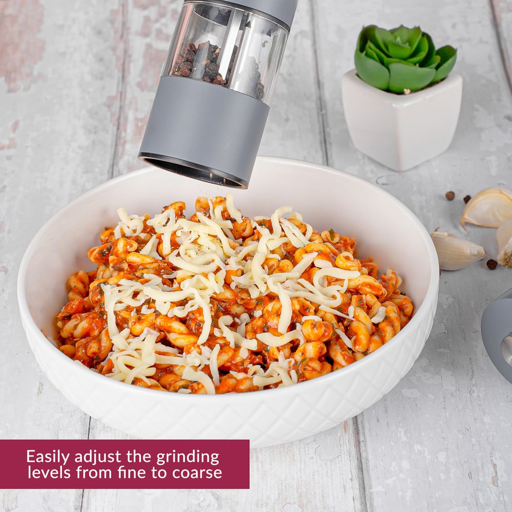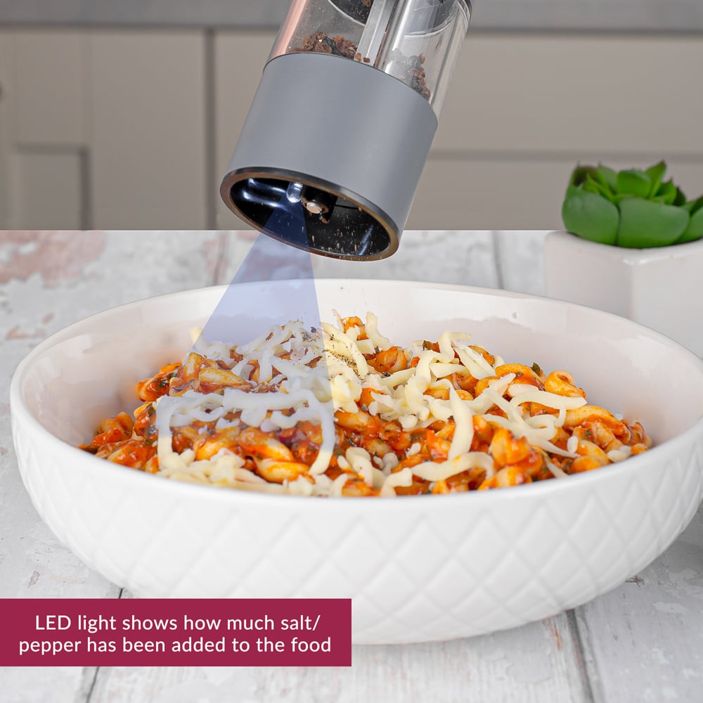 Innoteck Essentials electric salt and pepper mill set allows effortless single handed grinding at the touch of a button to season your dishes. Easily adjustable coarseness knob located underneath enabling a varied choice of super fine to coarse through the rust proof ceramic grinding mechanism. Built in LED light shows how much salt or pepper has been added to the food. This set is battery operated and easy to refill. Both grinders are made of durable stainless steel with a transparent casing so you can see how much ingredient is left.