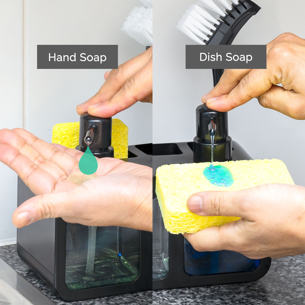 Innoteck Essentials Sink Organiser with 2-in-1 Soap Dispenser is designed to streamline your cleaning routine and keep your space neat and organised. It features dual compartments (350ml x2) for both hand soap and dish soap, with a smooth pump action for easy dispensing. The wide-mouth openings ensure quick and spill-free refills. This practical dispenser also includes four additional compartments to store sponges, brushes, and cloths (sponge/brush not included), ensuring your cleaning tools are always within reach. A removable drip tray at the bottom collects excess liquid, keeping your countertop dry. Made from high-quality PET plastic, the dispenser combines durability with a sleek, modern design that complements any kitchen.