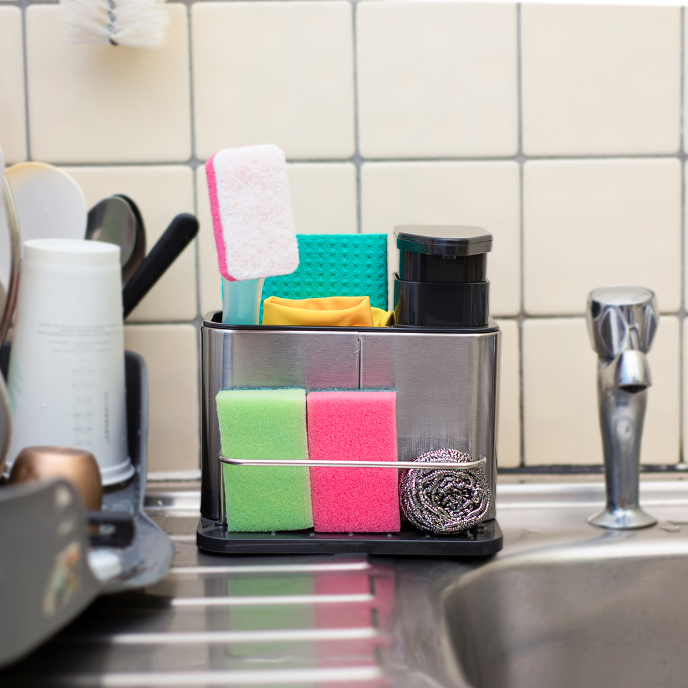 This stylish and practical sink organiser has a stainless steel rust-resistant body with a non-slip-based removable tray for easy cleaning and germ-free. It includes a 340ml refillable kitchen soap dispenser with a press pump and is designed with small compartments large enough to store cleaning supplies while taking up the least amount of counter space.