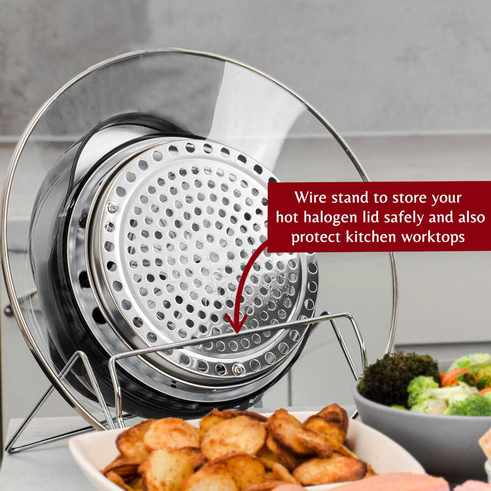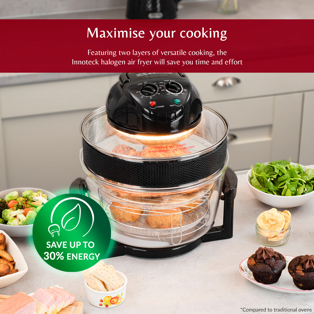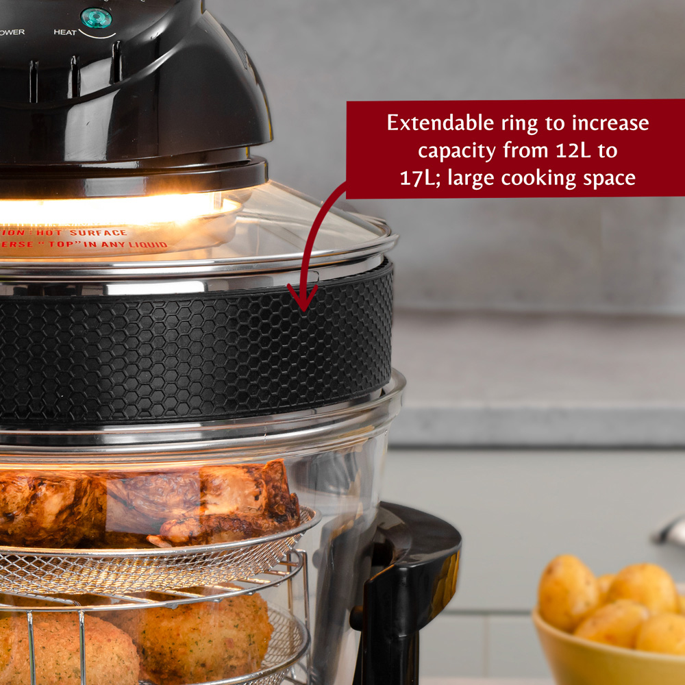 The 17L halogen air fryer with its 12 litre bowl with 5 litre extender ring offers an impressive cooking capacity, precise time and temperature control, all-round viewing, a bright interior light, and a comprehensive set of accessories. This versatile appliance is a user-friendly addition to any kitchen, enabling you to effortlessly prepare delicious meals for gatherings of any size while maintaining full control over your cooking process. Enjoy your favourite meals guilt-free, thanks to air circulation technology that allows you to cook with no oil or a little spray oil for browning. Cleaning has never been simpler, simply fill with hot, soapy water and set to self-clean. Clean and ready for the next time.