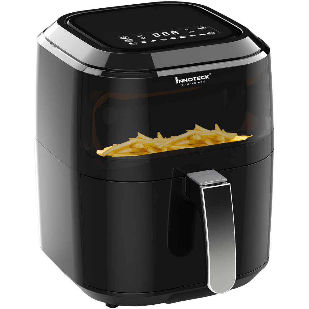 Innoteck Kitchen Pro 5 Litre Digital Visible Air Fryer being compact enough to fit your countertop. Viewing window design with Internal light allows you to easily see the meal whilst it's cooking. Variable Temperature Control (80 – 200°C) and timer up to 60 mins. All in 1 Air Fryer allows you to cook with functions of air frying, roast, grill, bake and keep warm and more by the click of a button on digital panel on top, just the setting you require and go. Rapid Air Circulation Technology traps heat and evenly distributes it around the metal interior so dishes and snacks are cooked too absolute perfection. 1400 watts, elegantly designed cooking power that evenly circulates hot air for perfectly cooked foods.
