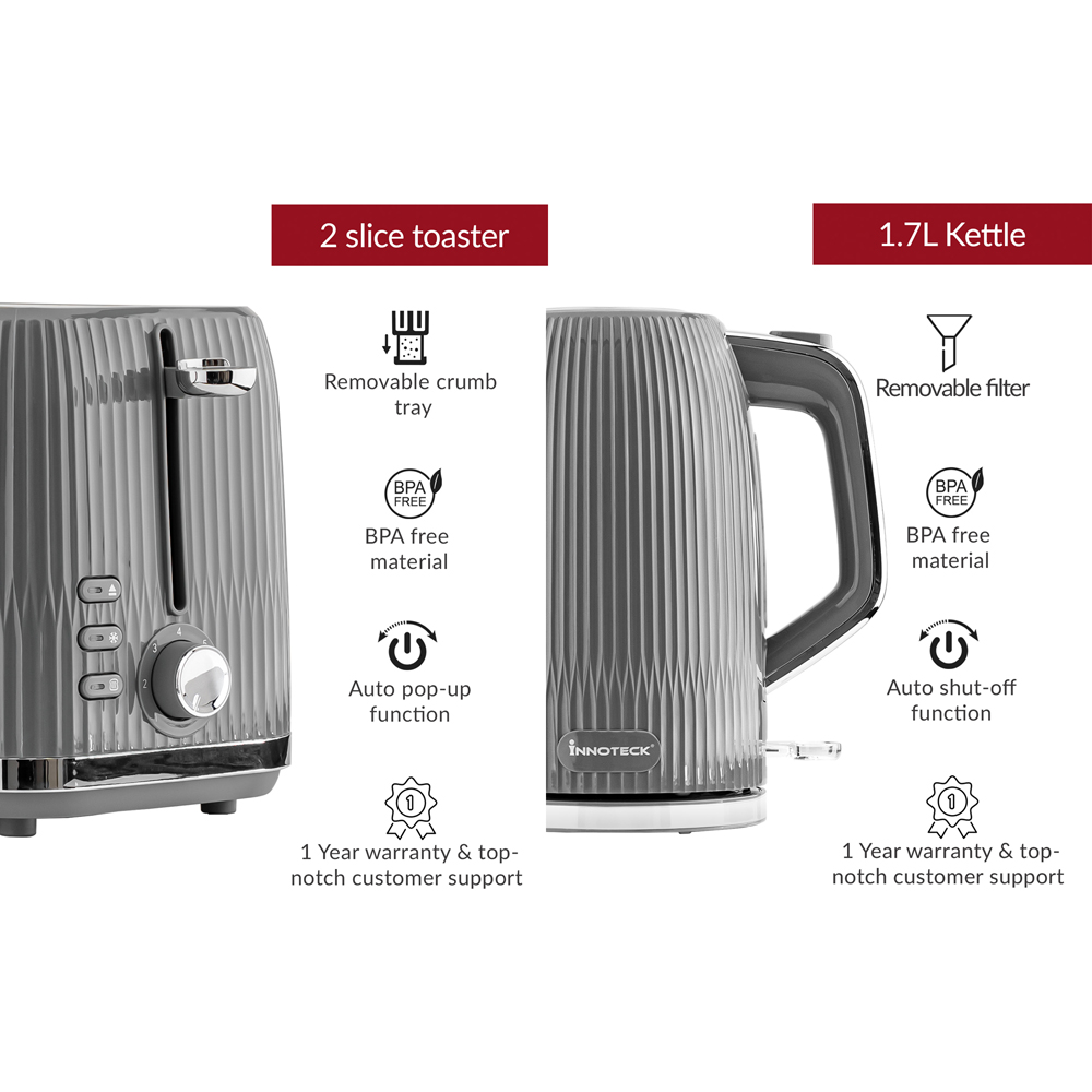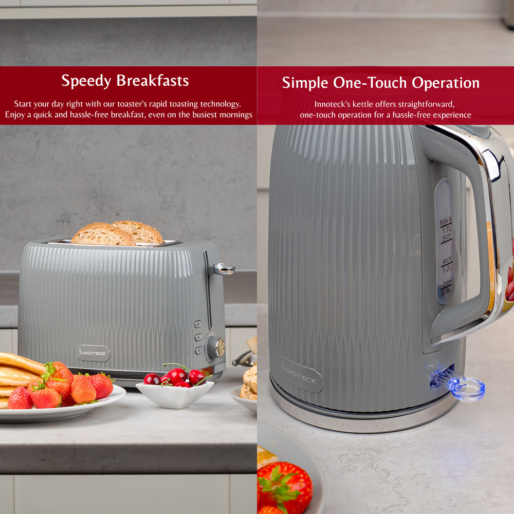 Innoteck Kitchen Pro 1.7L Electric Kettle and Toaster Breakfast Set with Green Ridged Textured and Stainless-Steel Body are designed for a quick and convenient breakfast routine. The toaster is equipped with advanced heating elements for fast and even toasting, ensuring your bread is perfectly golden in no time. The electric cordless kettle boasts rapid boiling capabilities, allowing you to have hot water for your beverages almost instantly.