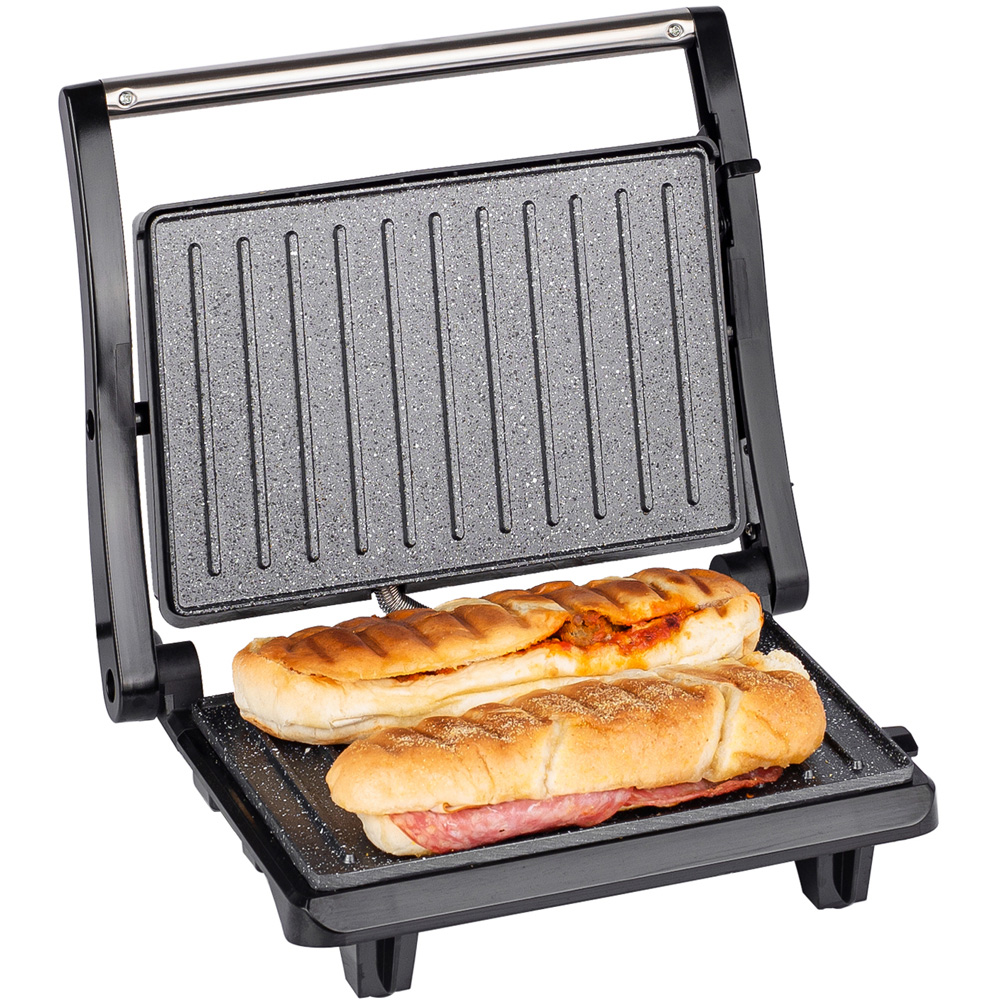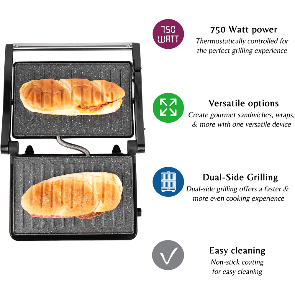 Innoteck Kitchen Pro multifunctional panini press and health grill is the ultimate kitchen companion that combines versatility, convenience and delicious cooking results. This Panini press is versatile in that it can be used open to 90 or 180 degrees like a grill or closed for sandwich making as a traditional Panini press. Floating hinge design ensure the perfect and even cooking. The marble coated non stick plates allow hassle free cooking and easy clean surfaces when you have finished. The indicator lights that let you know when the power is on and also lights up to indicate when the plates are up to temperature and ready for cooking. The 750W heating element ensures even and consistent results.