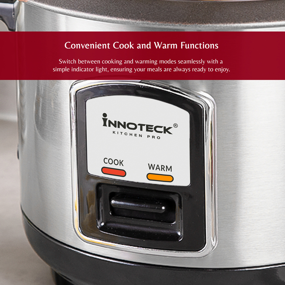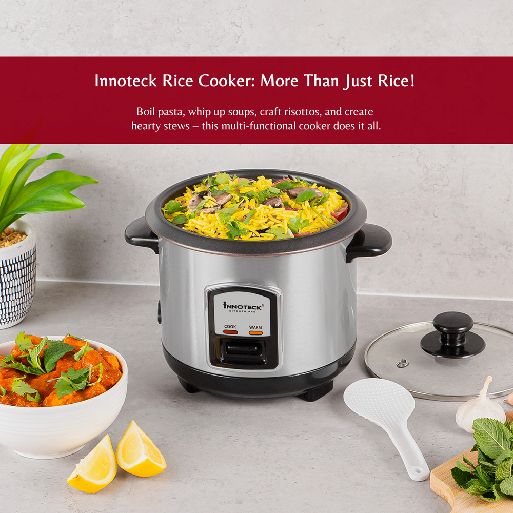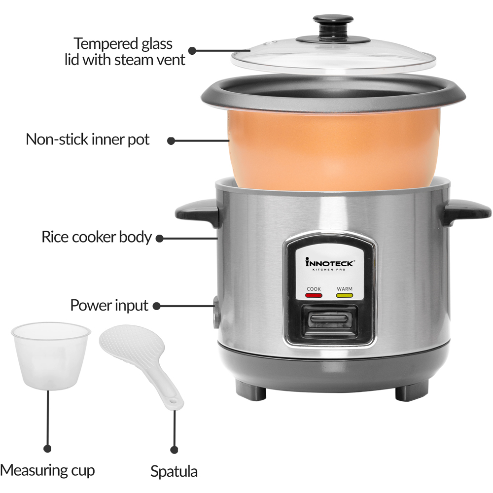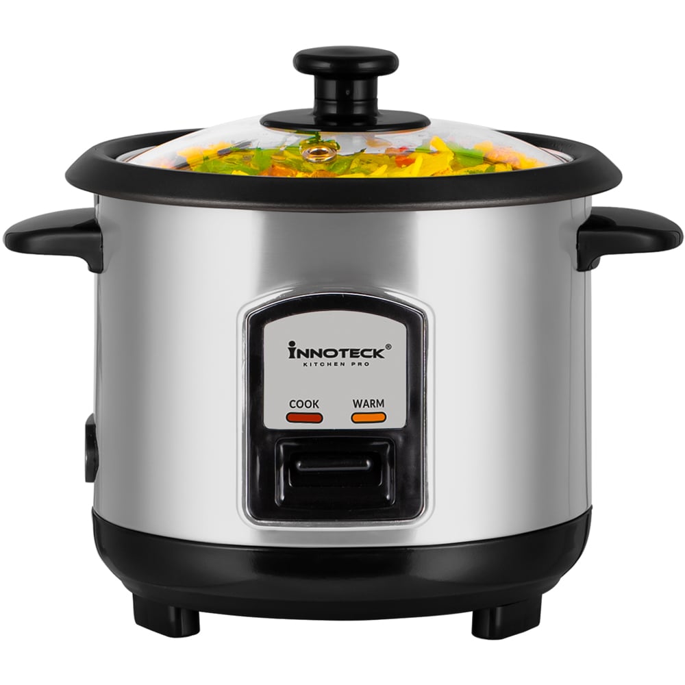 Innoteck Kitchen Pro stainless steel rice cooker has cook and warm functions. The cook setting ensures your rice, grains, or other dishes are cooked to perfection. Automatically switching to the warm setting once cooked. Comes with a removable non stick bowl which is easy to clean. Measuring cup and also spatula are included. With a compact 0.8L capacity, simply measure a maximum of four measuring cups of uncooked rice, ideal for small households or individual servings. Compact size but yet it is powerful 350W. Equipped with non-slip feet.